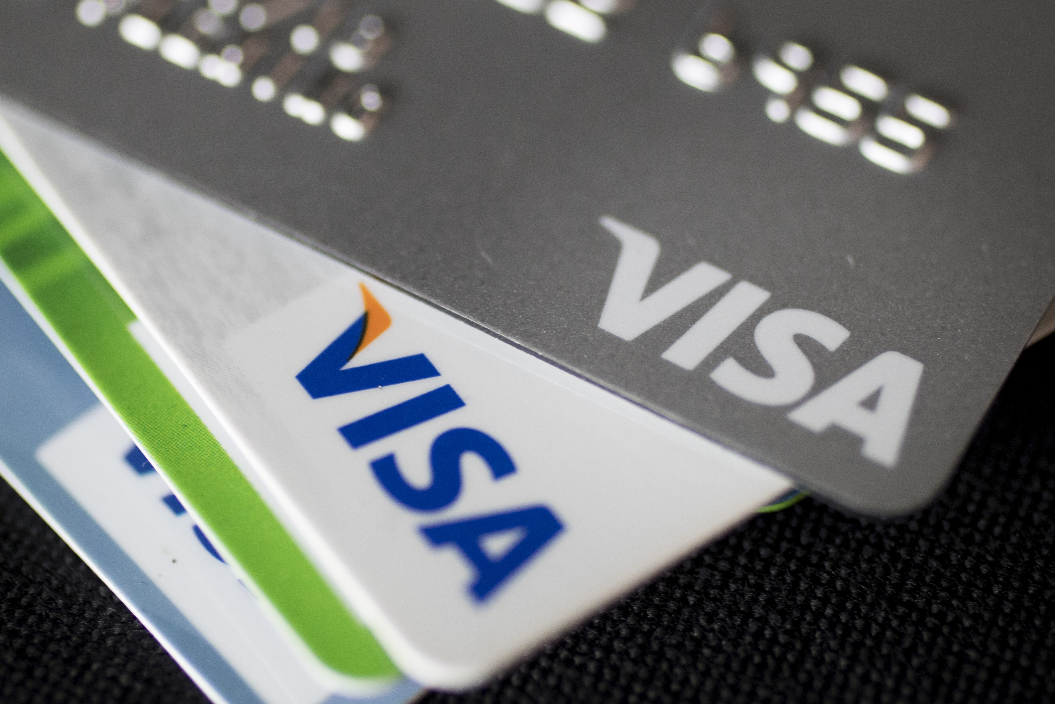 Visa Inc. credit cards are arranged for a photograph in Washington, D.C., U.S. (Photographer: Andrew Harrer/Bloomberg)