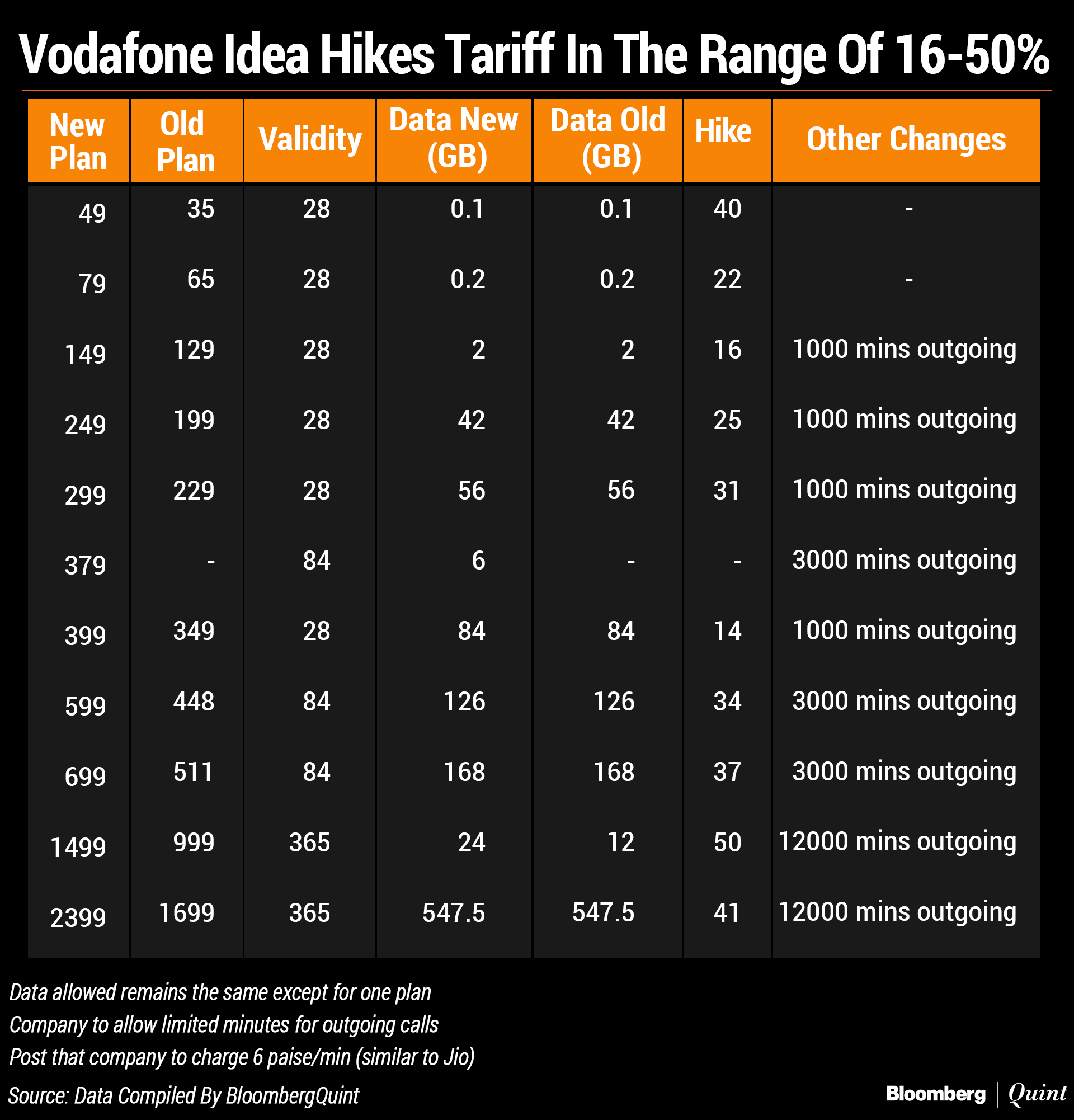 Vodafone Idea Ltd. has hiked prices of its prepaid plans by up to 42 percent, against the backdrop of a Supreme Court ruling on how telecom firms calculate revenue and unrelenting competition from peers, notably Reliance Jio Infocomm Ltd.