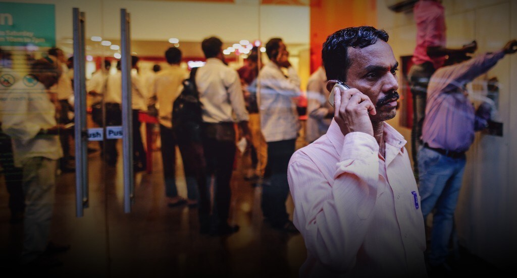 A man uses a mobile phone outside a Vodafone India Ltd. store in Mumbai, India (Photographer: Dhiraj Singh/Bloomberg)