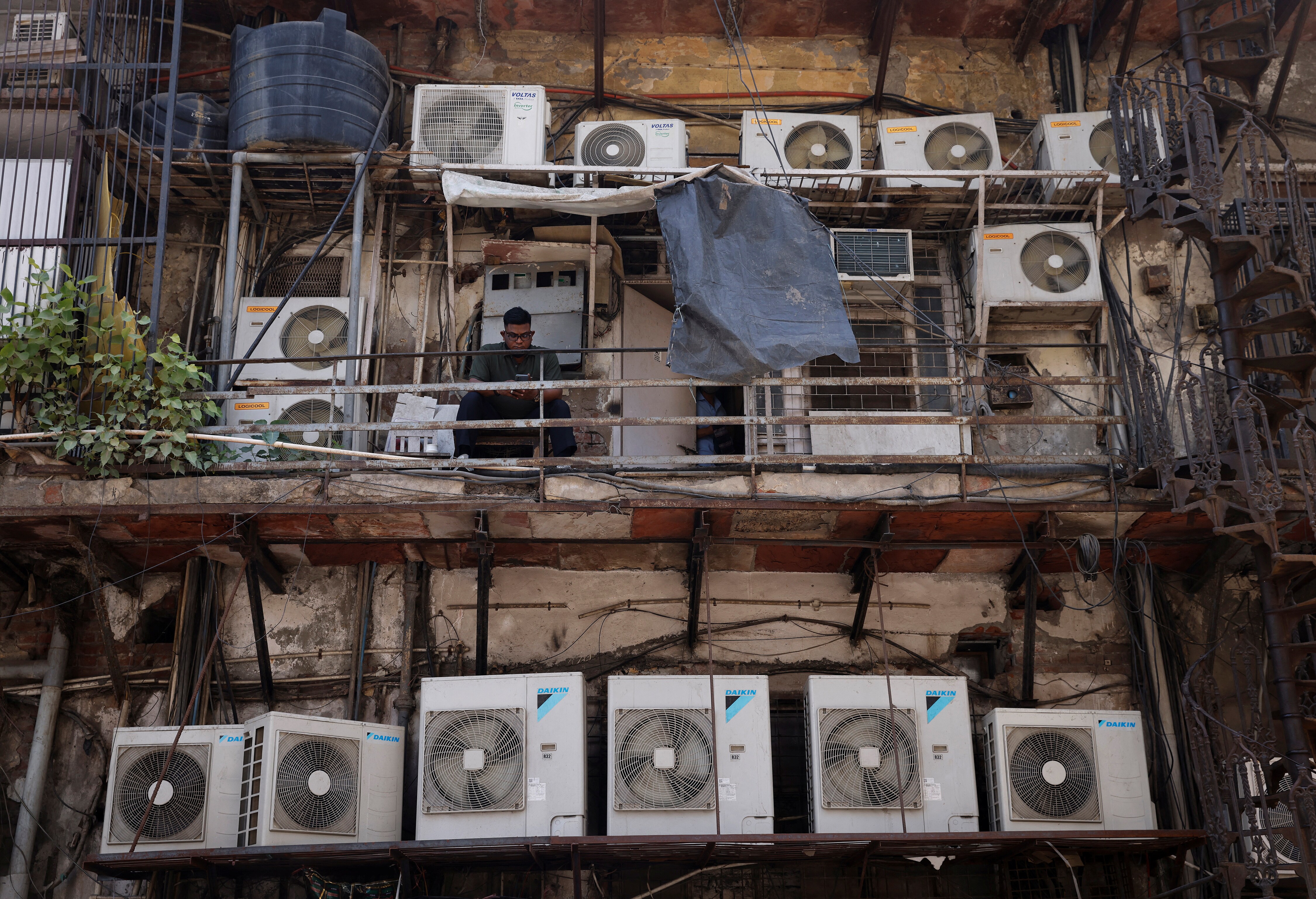 A man uses his mobile phone as he sits amidst the outer units of air conditioners. (Photo: Reuters/Adnan Abidi)