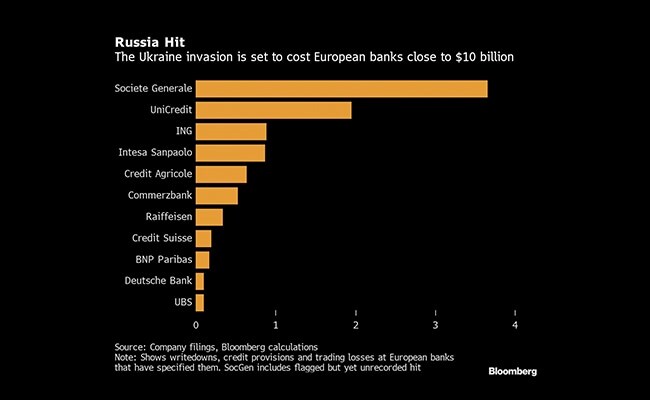 European banks including Societe Generale and UniCredit SpA have flagged combined hits of almost $10 billion from Russia, mostly from writing down the value of their operations and setting aside money as a shield against the expected economic ramifications.
