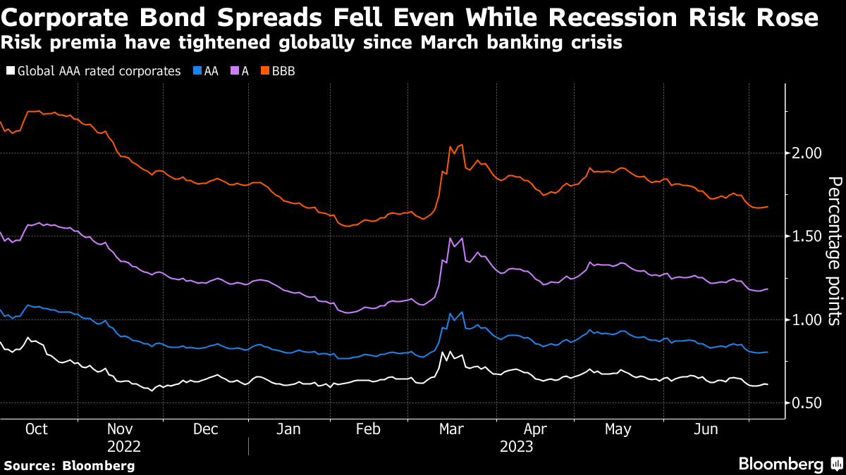 For now, fixed-income investors seem relaxed. The extra yield that investment-grade corporate debt pays pays over government bonds is nearing the lowest since just before the regional banking crisis left money managers looking for safe havens.