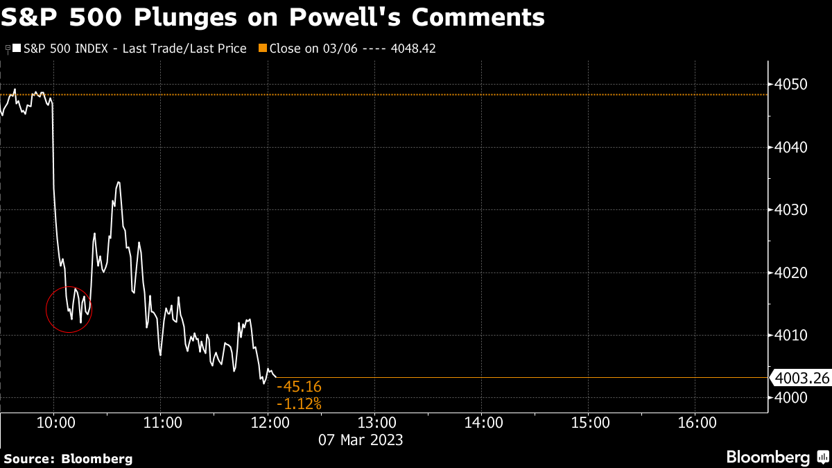 Treasuries sank to fresh lows after Powell said in prepared remarks that to battle persistent inflation the Fed was “prepared to increase the pace of rate hikes” and that the terminal rate “is likely to be higher than previously anticipated.” Swaps bets shifted to show traders now expect the Fed will be slightly more likely to announce a half-point hike rather than a quarter point move at their March meeting. The S&P 500 Index fell almost 1% before paring loses.