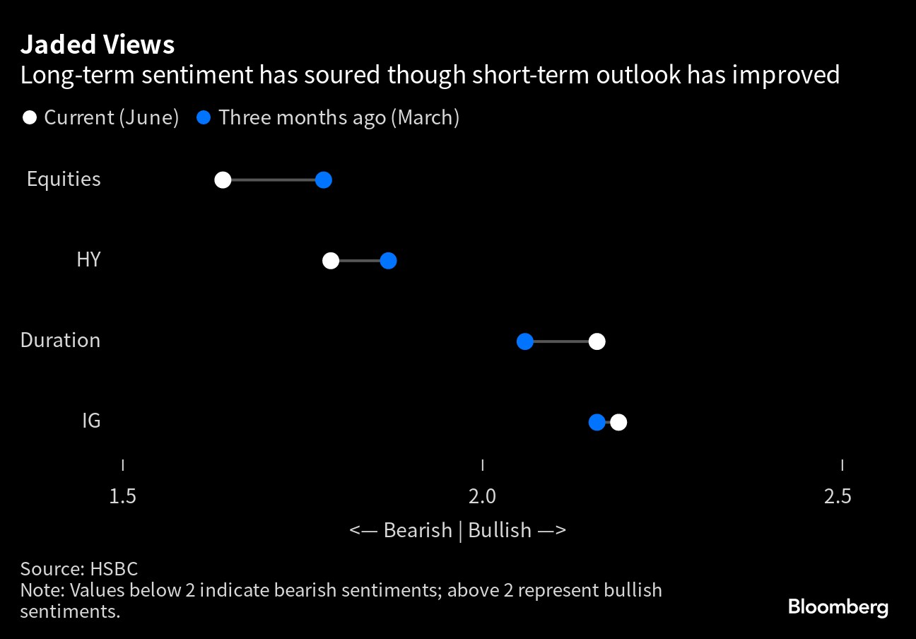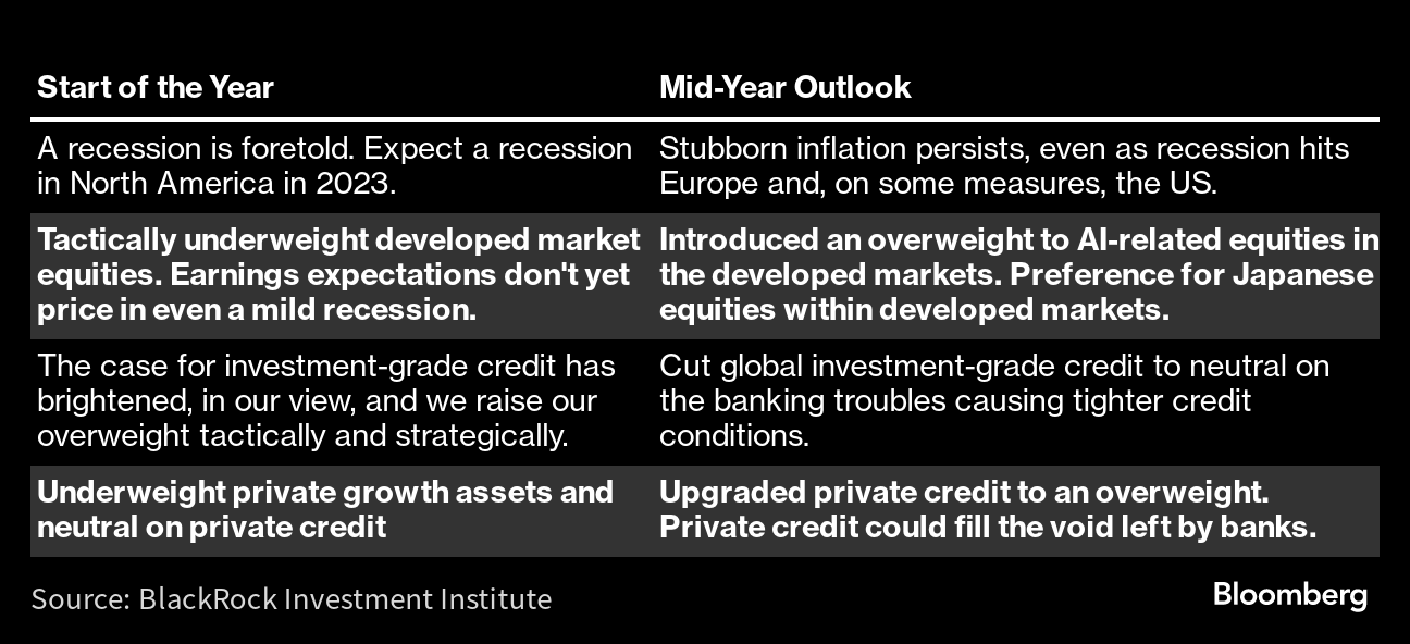 Some are now rescinding recommendations or pushing out the timing of their calls. JPMorgan Chase & Co. strategists recently ditched a recommended long position in five-year Treasuries. Those at BlackRock Investment Institute, who suggested a push into investment-grade bonds at the start of the year, now have a neutral view of the sector. At Bank of America Corp. — and elsewhere — the recession once expected for this year has been pushed out as growth holds up stronger than expected.Bespoke co-founder Paul Hickey was among those who weren't caught completely off guard. In January, he offered a contrarian outlook, saying that the negative consensus among strategists meant that risk assets like stocks may be poised for a rebound. “With consensus being so bearish to kick off the year, rather than needing a positive catalyst to spark a rally, all the market needed was a lack of bad news,” he said. “Whenever we are faced with conflicting messages from the news and the markets, we always defer to the markets.''After a 37% surge in the Nasdaq 100 Index this year, some strategists have revised their stock-market targets just to account for the equity rally — even if they see modest gains, or declines, for the rest of the year. Goldman Sachs has raised an initial 4,000 year-end target for the S&P 500 to 4,500 after the bank downgraded the odds of recession. It closed just shy of 4,400 Friday. Bank of America, Barclays, BNY Mellon Investment Management, Citigroup, Morgan Stanley and Wells Fargo Investment Institute are among those forecasting it will end the year lower than it is now. BlackRock is betting on the AI boom, even as it continues to warn about the dangers haunting developed-market equities.But even with about a third of the two dozen strategists surveyed by Bloomberg already upgrading their targets and measures of short-term sentiment improved, big investors remain cautious. A survey by HSBC Holdings Plc of the largest 60 asset managers shows they have turned more dour on the long-term outlook, making them even more pessimistic on high-yield bonds and stocks and fueling an even stronger preference for long-duration government debt. At the same time, the average of strategists' year-end outlooks represents a decline of around 8% in the S&P 500 in the last six months of 2023. That's the most bearish second-half view since at least 1999.