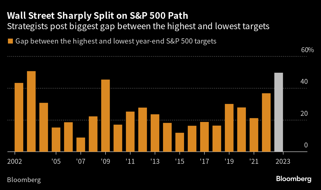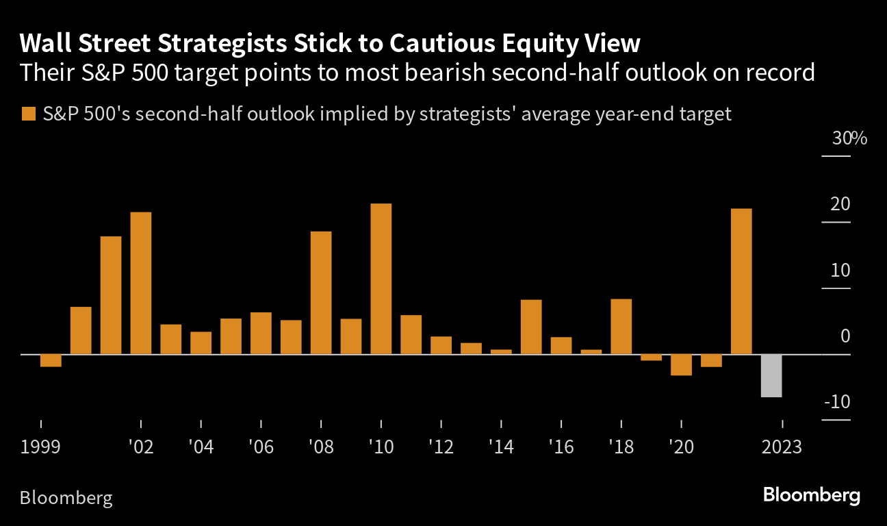 (Bloomberg) -- Up and down Wall Street, forecasters were caught flat-footed by how the first half of 2023 unfolded in financial markets. That seems to have rattled their faith in what the winning playbook for the rest of it should be. Heading into the year, a handful of predictions dominated strategists' annual outlooks. A global recession was imminent. Bonds would trounce stocks as equities re-tested bear-market lows. Central banks would soon be able to stop the aggressive rate hikes that made 2022 such a year of market misery. As growth stumbled, there'd be more pain for risky assets. But that bearish outlook was shattered as stocks rallied even as the Federal Reserve continued to ratchet up interest rates in the face of stubbornly elevated inflation. And what was supposed to be the Year of the Bond fizzled: US Treasuries have nearly wiped out their tiny gain for the year as yields test new highs and the economy remains surprisingly resilient in the face of the Fed's monetary policy onslaught. As a result, financial soothsayers have rarely disagreed more about where markets are headed next. That's brought into relief by forecasts for where the S&P 500 will end the year: There's a 50% difference between the most bullish one from Fundstrat (which sees it rising nearly 10% more to 4,825), and the most bearish call from Piper Sandler (down some 27% to 3,225), according to those compiled by Bloomberg. The mid-year gulf hasn't been that wide in two decades.
