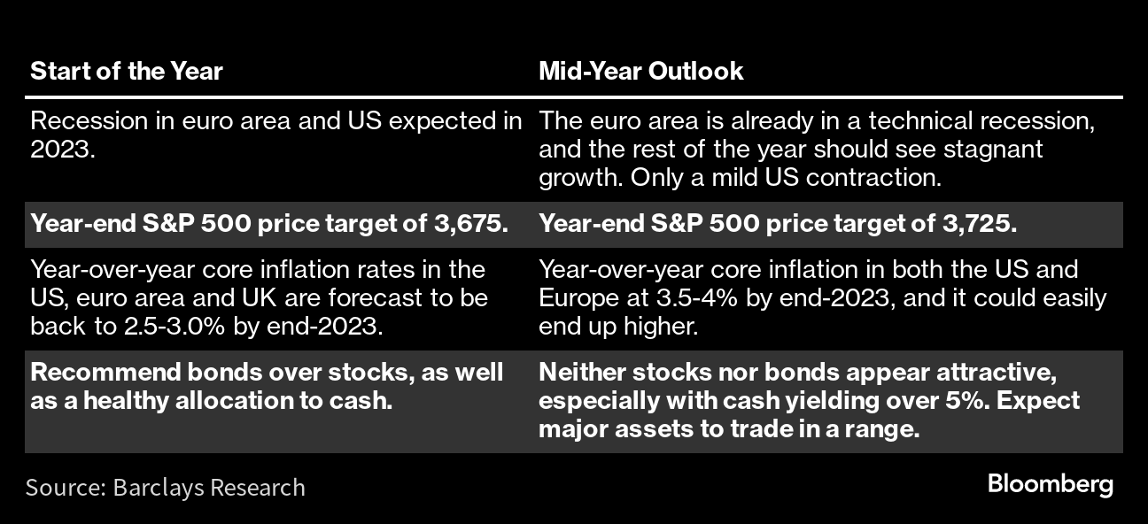 Barclays ResearchThe firm has given up on their preference for bonds over stocks and sees milder economic contraction in the US.