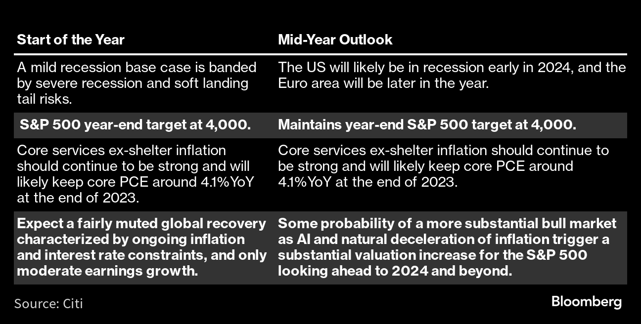 CitiThe bank has maintained a US stocks target that suggest losses in the second half and sees a US recession in 2024.