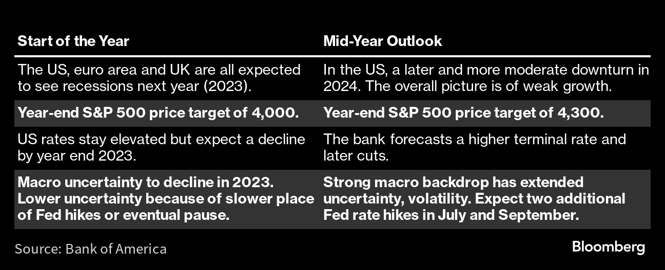 Here's a sampling of what some of the biggest names are telling clients:Bank of AmericaThe bank has revised higher its target for US stocks and predicts a later and milder recession in the US.