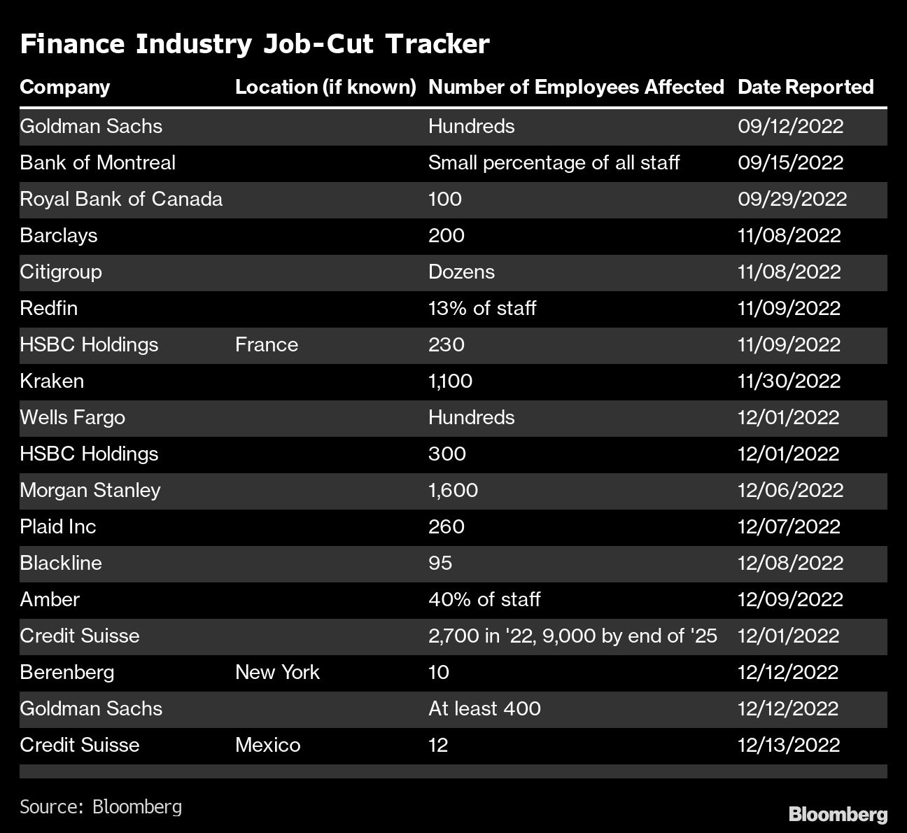 Goldman Sachs Group Inc., Morgan Stanley, Credit Suisse Group AG and Barclays Plc have all either already fired staff or announced that they plan to do so in coming months. Some smaller firms have even completed multiple rounds of terminations.