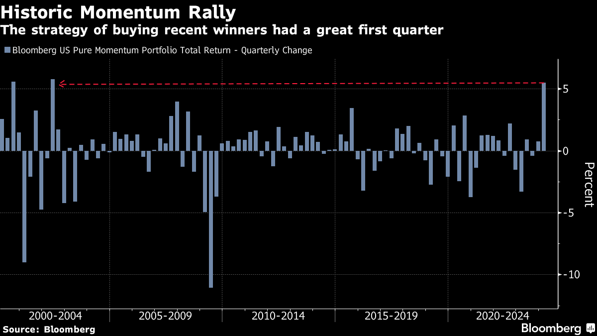 Known as the momentum factor, the rules-based investing style that buys up winners over the past year like the mighty Nvidia Corp. — while selling losers like Warner Bros. Discovery Inc. — has notched its best quarter since 2002, according to a long-short portfolio compiled by Bloomberg.
