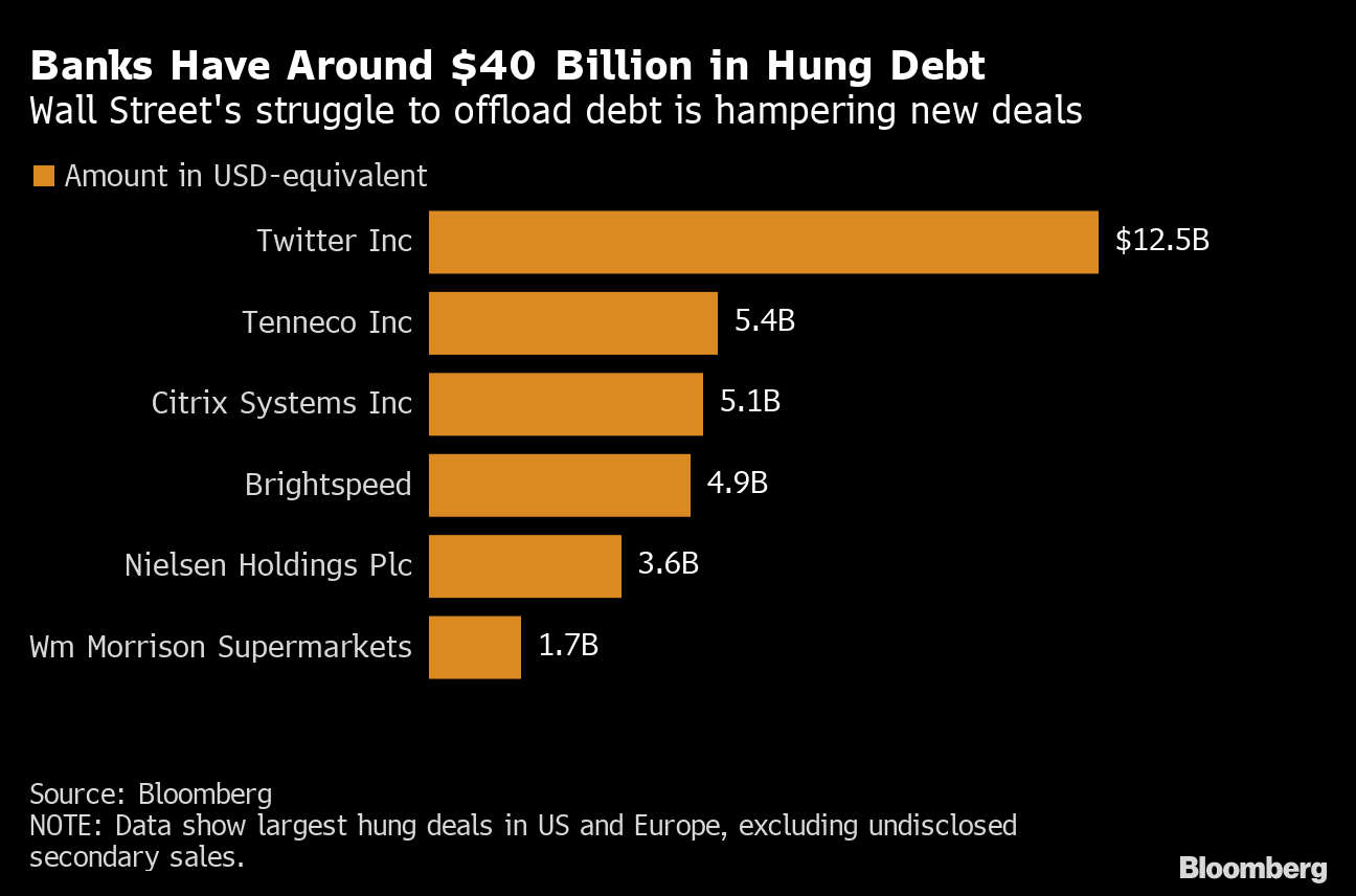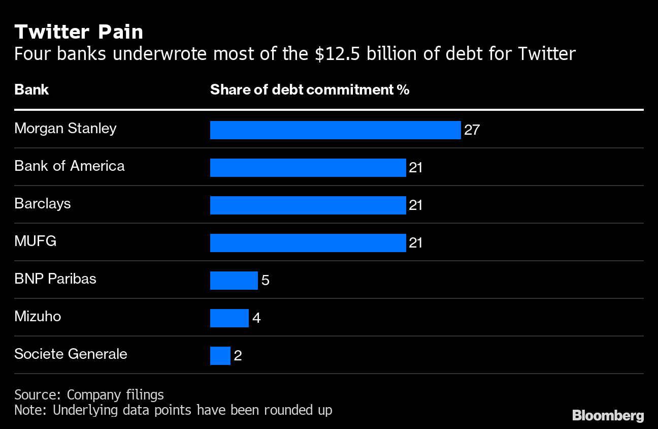 After driving a flurry of mega buyouts that contributed to a $1 trillion profit haul in the good times, some of the world's largest banks have been forced to take big writedowns on debt-fueled mergers and acquisitions underwritten late in the cheap-money era. Elon Musk's chaotic takeover of Twitter Inc. is proving especially painful, saddling a Morgan Stanley-led cohort with around $4 billion in estimated paper losses, according to industry experts and Bloomberg calculations.