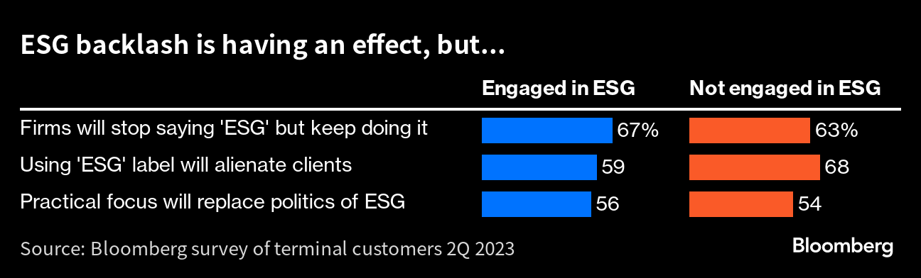 Against that backdrop, investors and bankers are avoiding saying “ESG” in meetings with clients, according to a recent Bloomberg survey. However, they're still integrating what ESG stands for in their work, the same survey showed.