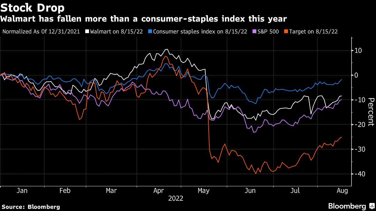 Walmart is trying to weather a shift in consumer spending habits as inflation forces shoppers to pay more for essential goods. That's leaving less money for purchases of general merchandise, which are typically more lucrative for Walmart than groceries, while also forcing the company to mark down prices on apparel and other items to deal with its bloated inventory.