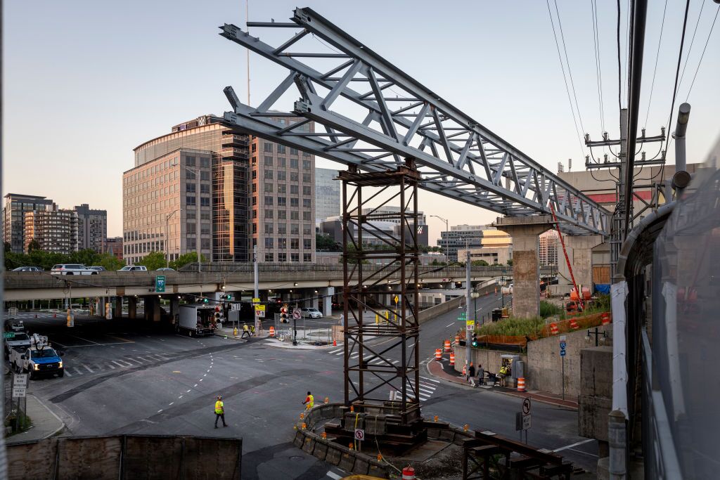 Workers connect a new pedestrian bridge at the Stamford Transportation Center in Stamford, Connecticut. (Photo by John Moore/Getty Images)