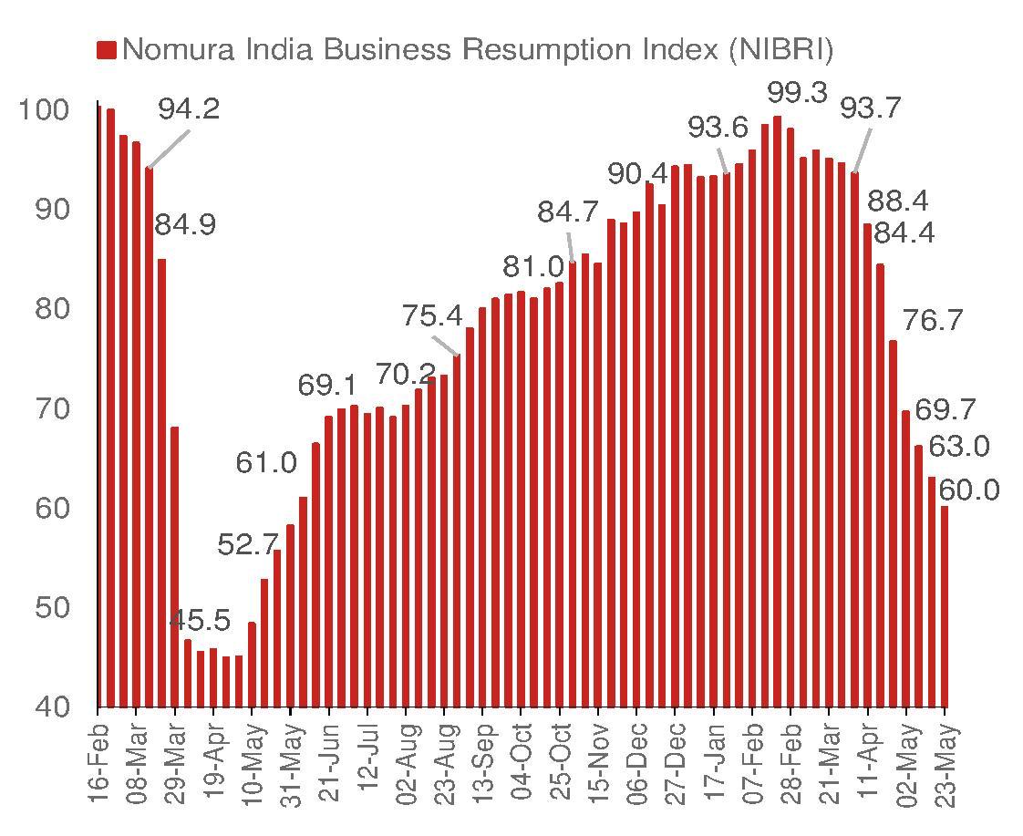 The labour participation rate moderated to 39.4% from 40.5%, with the unemployment rate up at 14.7% from 14.4% last week, near the one-year high, said a research note by Nomura on Monday. Along with the continued hit to mobility and weakening power demand, that pushed the Nomura India Business Resumption Index to 60 for the week ended May 23, from 63 the prior week.
