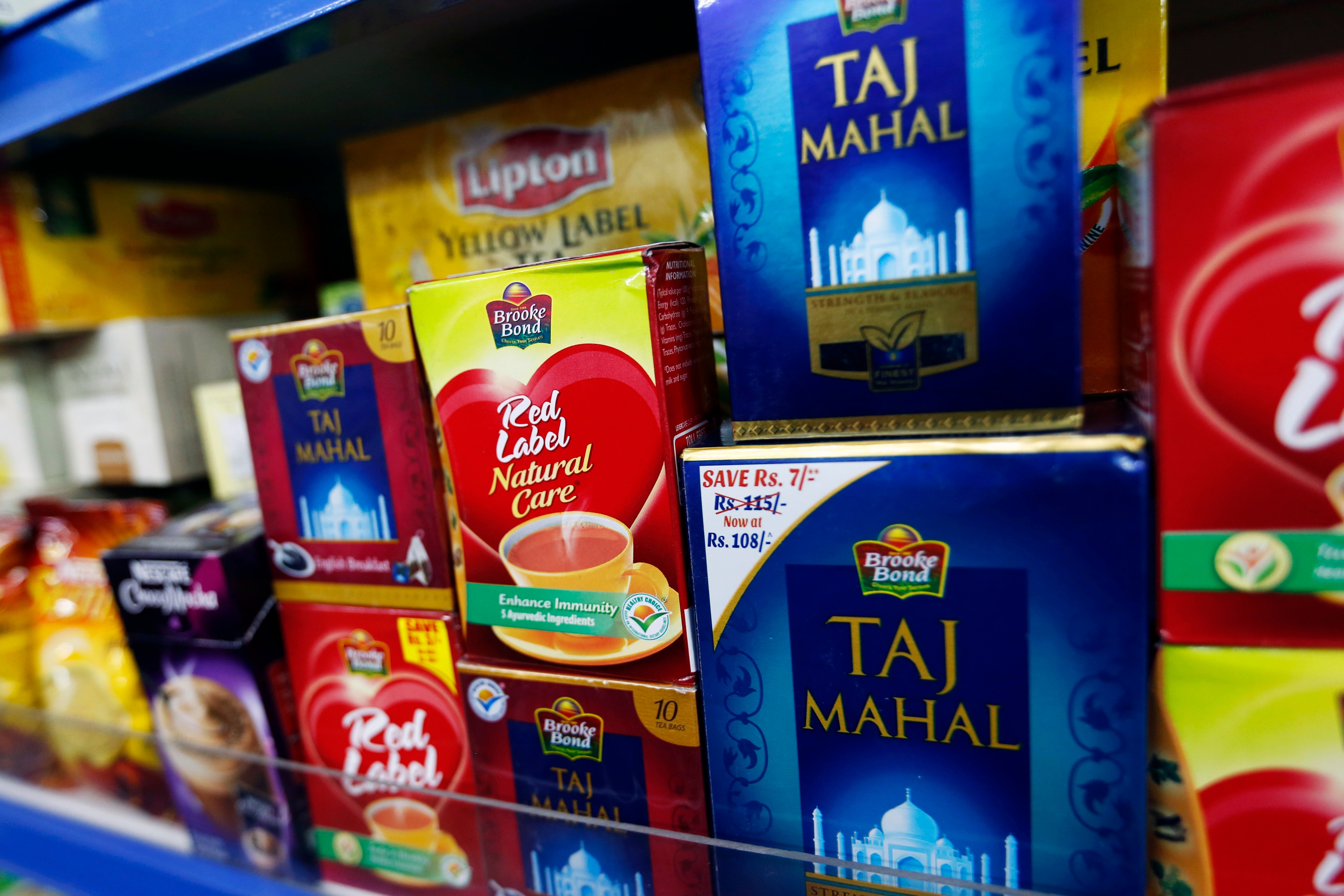 Boxes of Brooke Bond Taj Mahal and Red Label teas, both manufactured by Hindustan Unilever Ltd., are displayed for sale at a general store in Mumbai. ( Photographer: Vivek Prakash/Bloomberg)