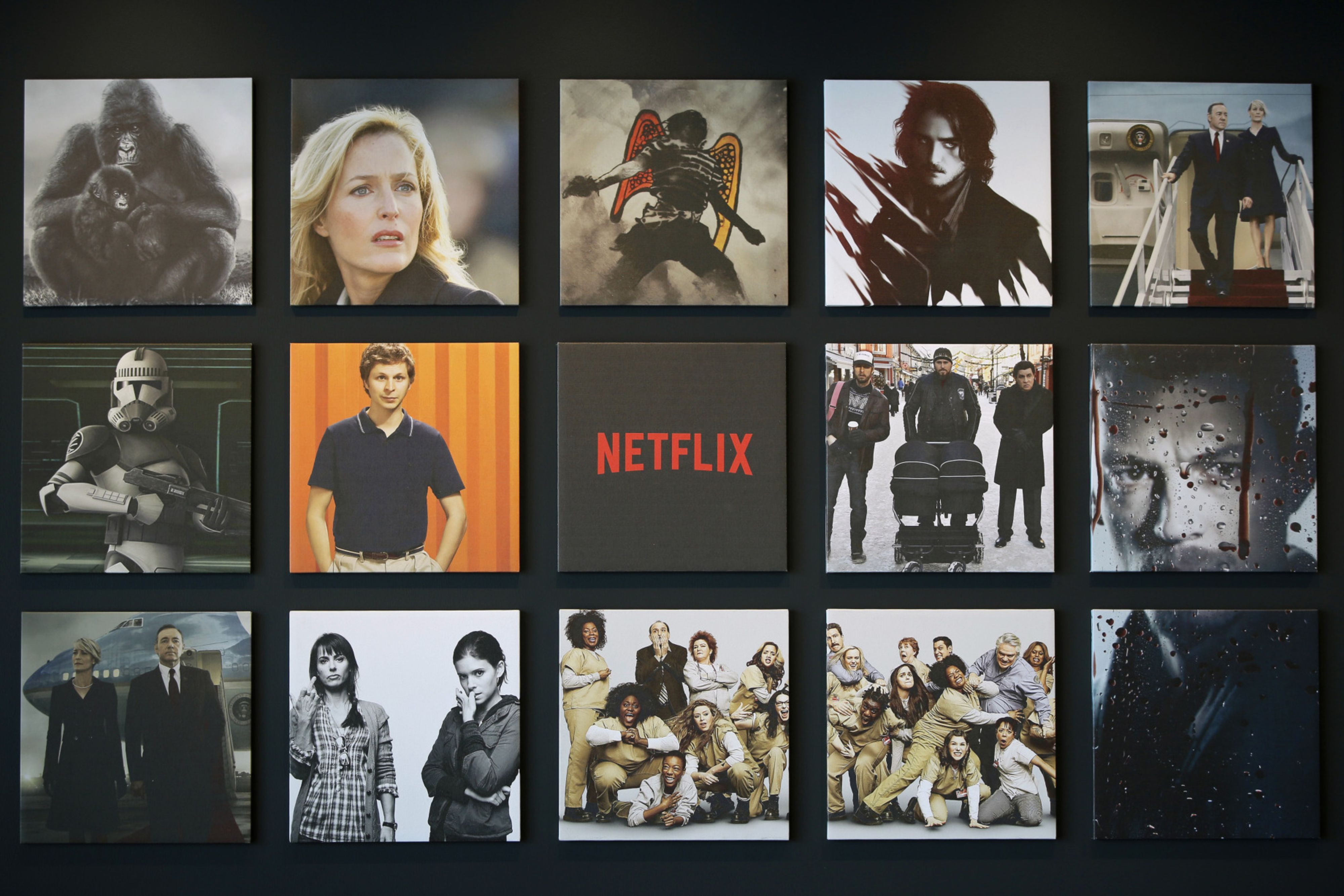 Promotional images of Netflix programs are displayed on a wall at the Netflix Japan office. (Photographer: Kiyoshi Ota/Bloomberg)