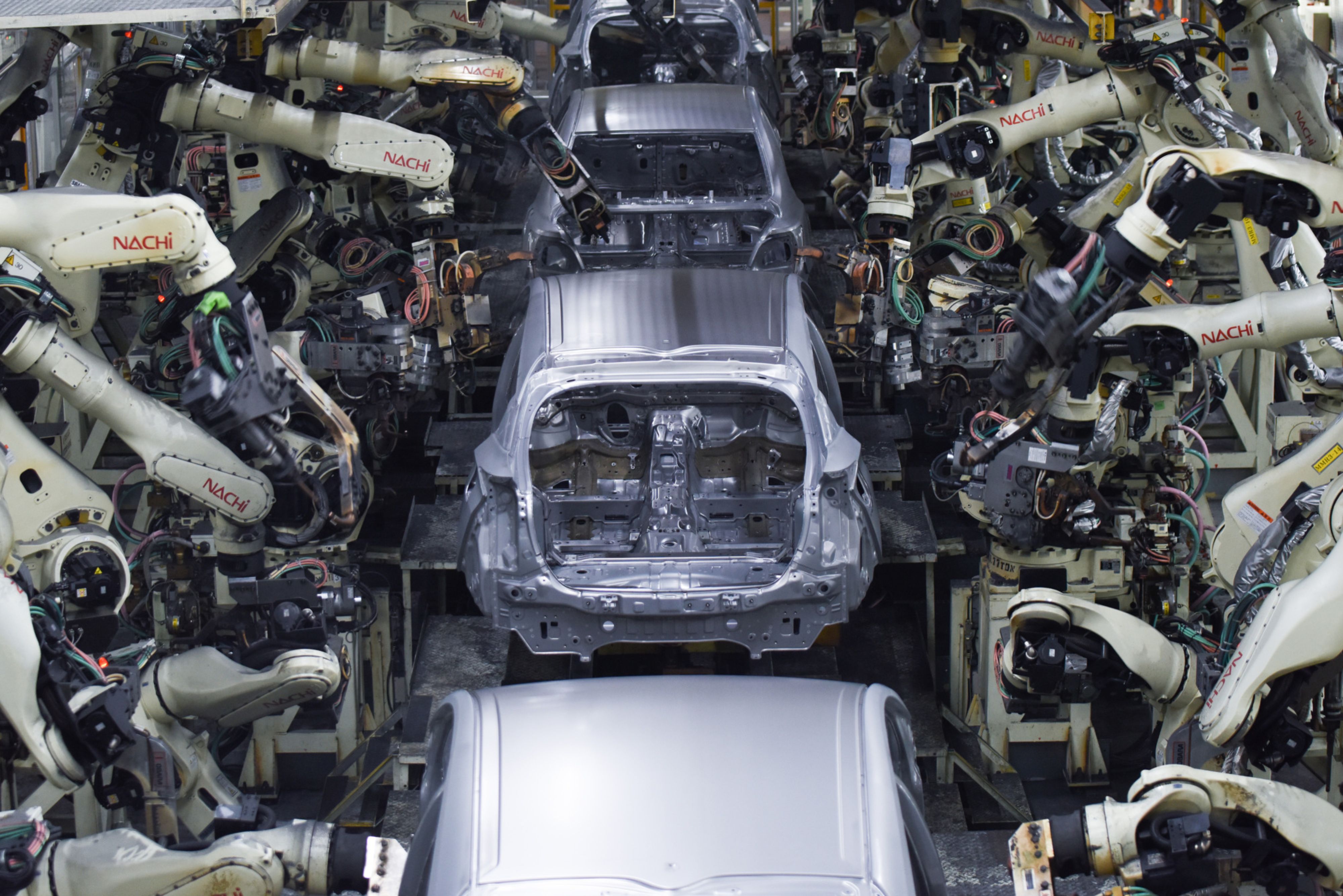 Robotic arms weld automobile body frames on the production line of the Toyota Motor Corp. plant, in Aichi, Japan. (Photographer: Noriko Hayashi/Bloomberg)