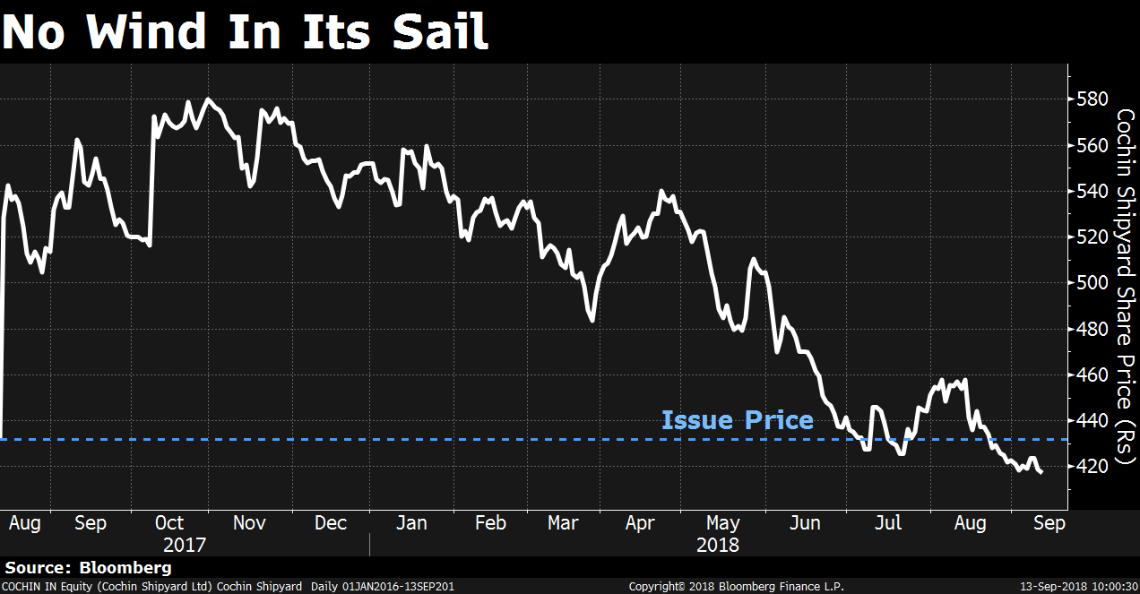 Cochin Shipyard's stock has fallen more than 20 percent so far this year. Till Aug. 11, a year after making its market debut, the stock commanded a 23 percent premium over the initial public offering price. It has since lost all gains and is trading at a discount of 3 percent to the IPO price.