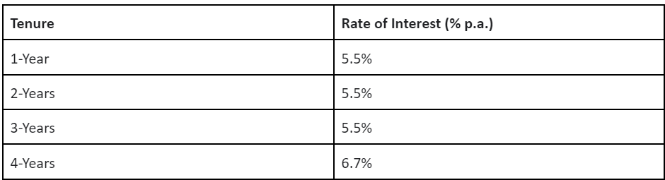 Investors have the choice to choose between 4 different tenures- 1-year, 2-years, 3-years, and 5-years. The 5-year time deposit offers the highest rate of interest at 6.7%.