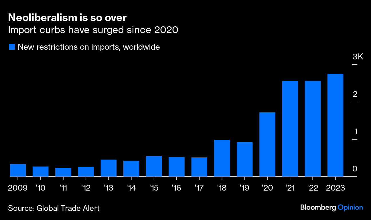 Regardless of your views on globalization, you should care. Unrepentant neoliberals like myself see the rising tide of trade protection and deliberate economic fragmentation as a grave mistake. On our view that liberal trade is good, a suitably refurbished and effective WTO is an essential component of rising global prosperity. But even dedicated advocates of tariffs, subsidies, planning, industrial policy, friend-shoring, reshoring and all the rest ought to see the need for a well-functioning WTO – because fragmentation ought to be, at the very least, orderly and cooperative rather than chaotic. And chaotic fragmentation is exactly where the world economy is heading.