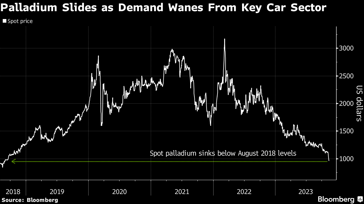 Palladium slid below $1,000 an ounce for the first time in five years last week as demand falters for the precious metal that's almost entirely used in catalytic converters of gas-powered cars.