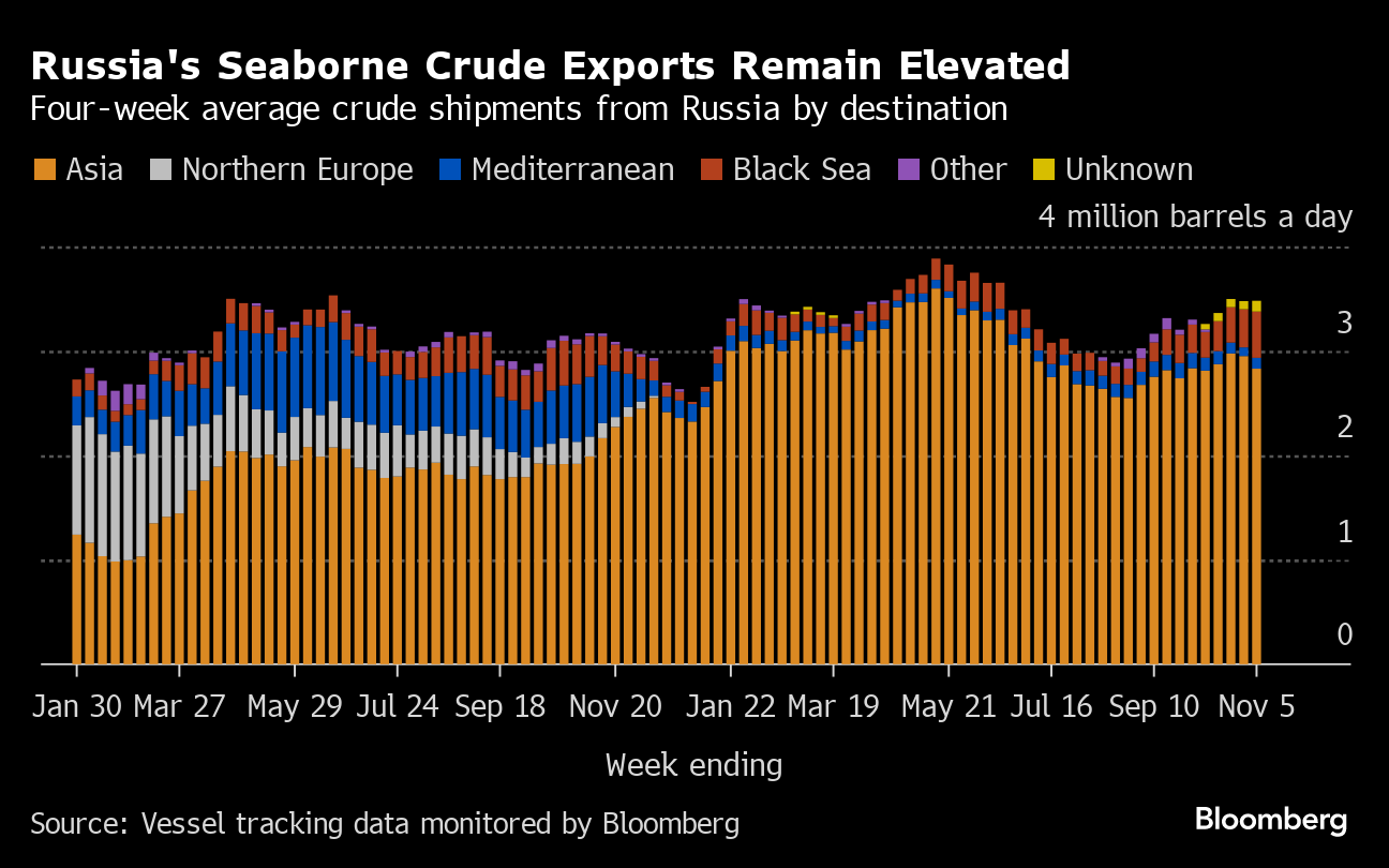 Russia is shipping crude through its ports at a rate close to the highest seen in more than four months. Shipments remain elevated just weeks before the OPEC+ group of oil producers, jointly led by Russia and Saudi Arabia, meet in Vienna on Nov. 26 to set output targets for the first half of next year.
