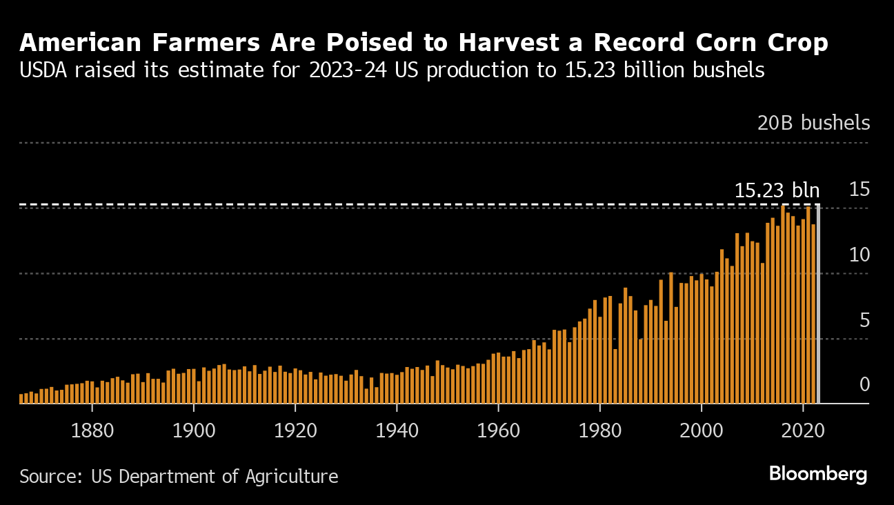 The US corn harvest is now expected to hit a record 15.234 billion bushels this year, according to a surprising estimate from the US Department of Agriculture last Thursday that drove down prices to lows not seen since 2020.