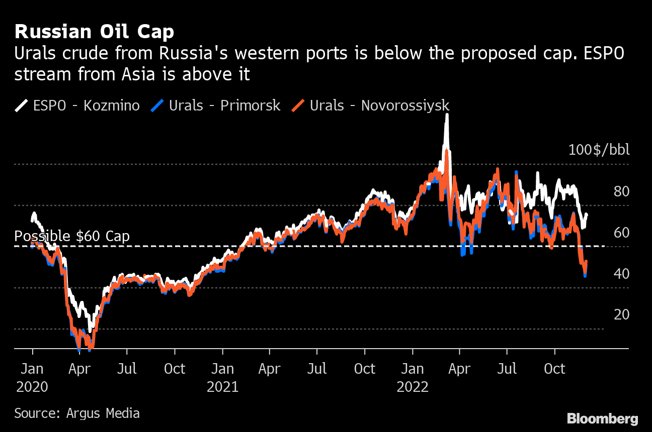 (Bloomberg) -- The Group of Seven is set to impose a price cap on Russian oil that's well above where it now trades. If there was ever any doubt what the premise of the cap was, it's now clear: the US and its allies want Russia's crude to keep flowing.