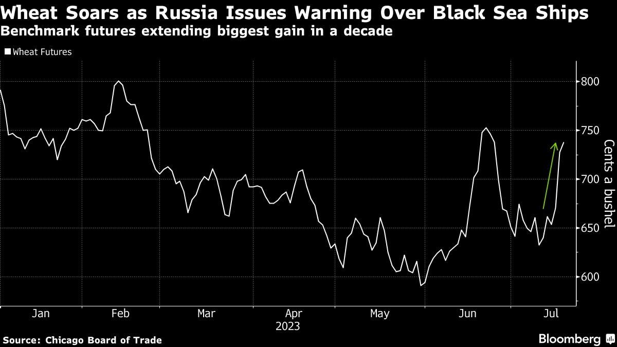 (Bloomberg) -- Wheat kept rising — following the biggest daily surge in a decade on Wednesday — as Russian threats against ships sailing to Ukrainian ports escalated a conflict over grain exports from the Black Sea region.
