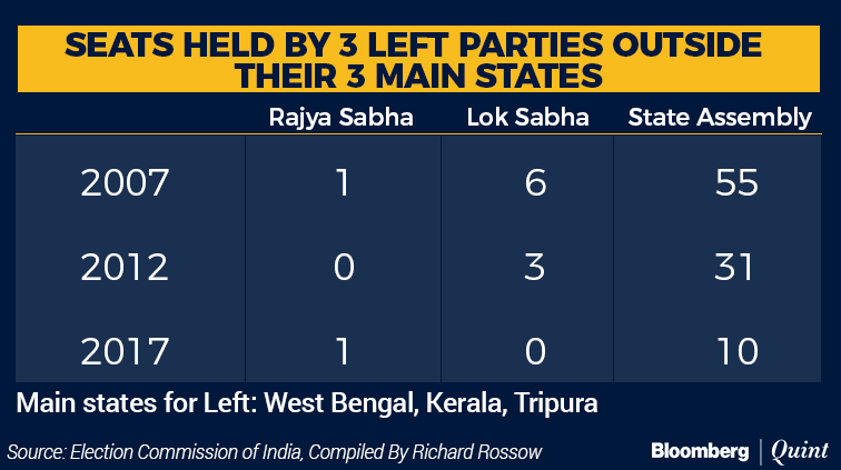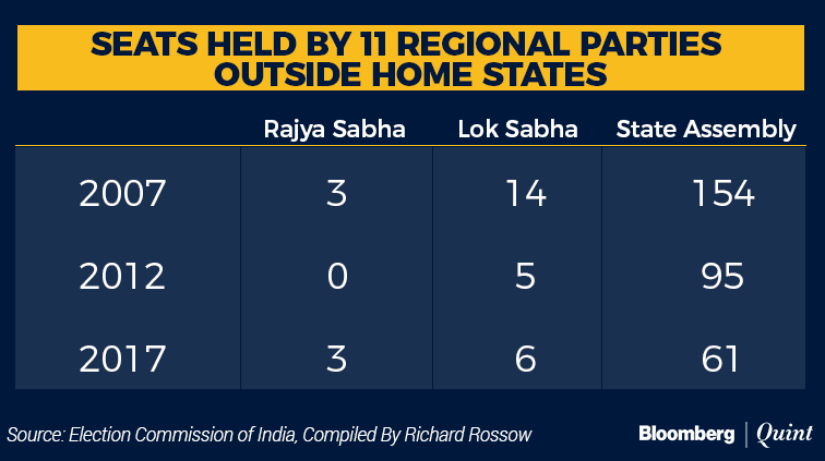 Looking back over the last ten years, these regional parties' collective reach has generally declined somewhat outside of their home states. In 2007, these eleven parties combined to hold 3 Rajya Sabha, 14 Lok Sabha, and 154 state assembly seats from non-core states. In 2012 these same parties did not have a single Rajya Sabha seat outside their core states, though they did hold 5 Lok Sabha seats and 105 state assembly seats. Currently, these parties combine to hold 3 Rajya Sabha, 6 Lok Sabha, and 61 state assembly seats outside their core states.