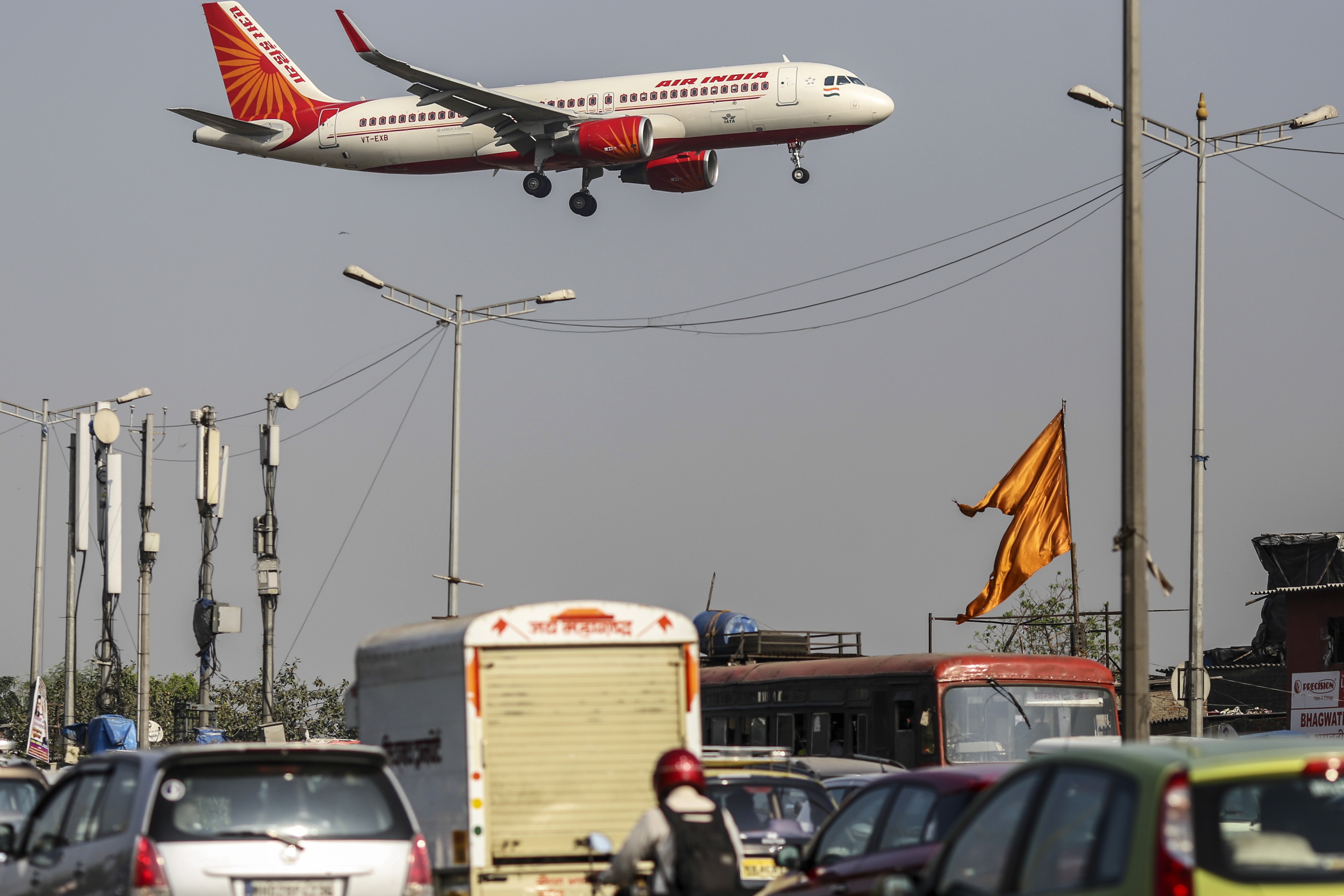 An Air India Ltd. aircraft passes over traffic as it prepares to land at Chhatrapati Shivaji International Airport in Mumbai, India. (Photographer: Dhiraj Singh/Bloomberg)