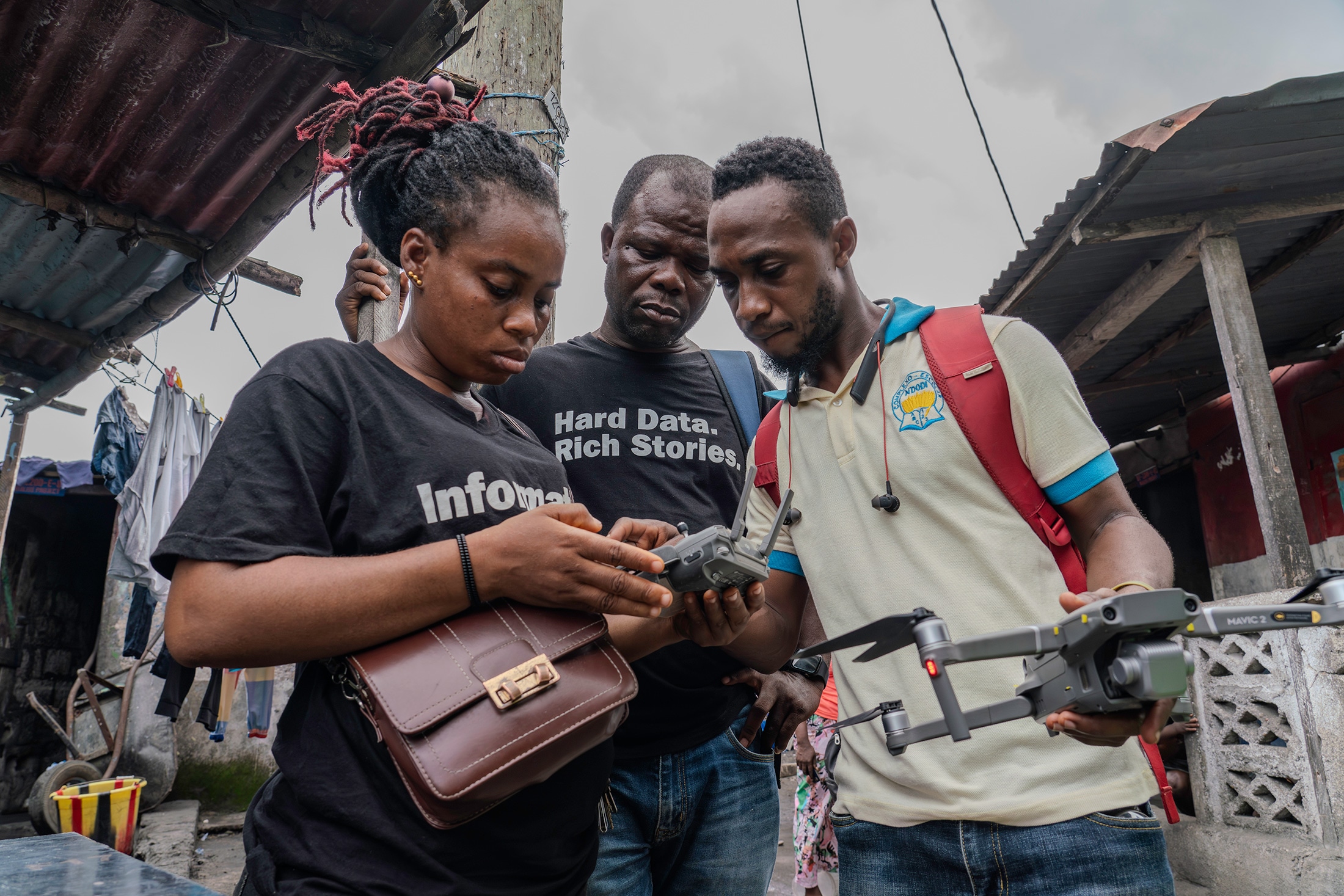 About 5 miles north of Gamys' drone, Tetee Nyewan, a mapper from Folups knocks on a family's door in an informal settlement known as Duala. She takes note of the house's condition and tells its inhabitants she's there to collect data about the flooding risk in low-lying neighborhoods. Over the next 20 minutes, Nyewan asks them dozens of questions, while three other Duala residents, in training to become mappers themselves, look on.