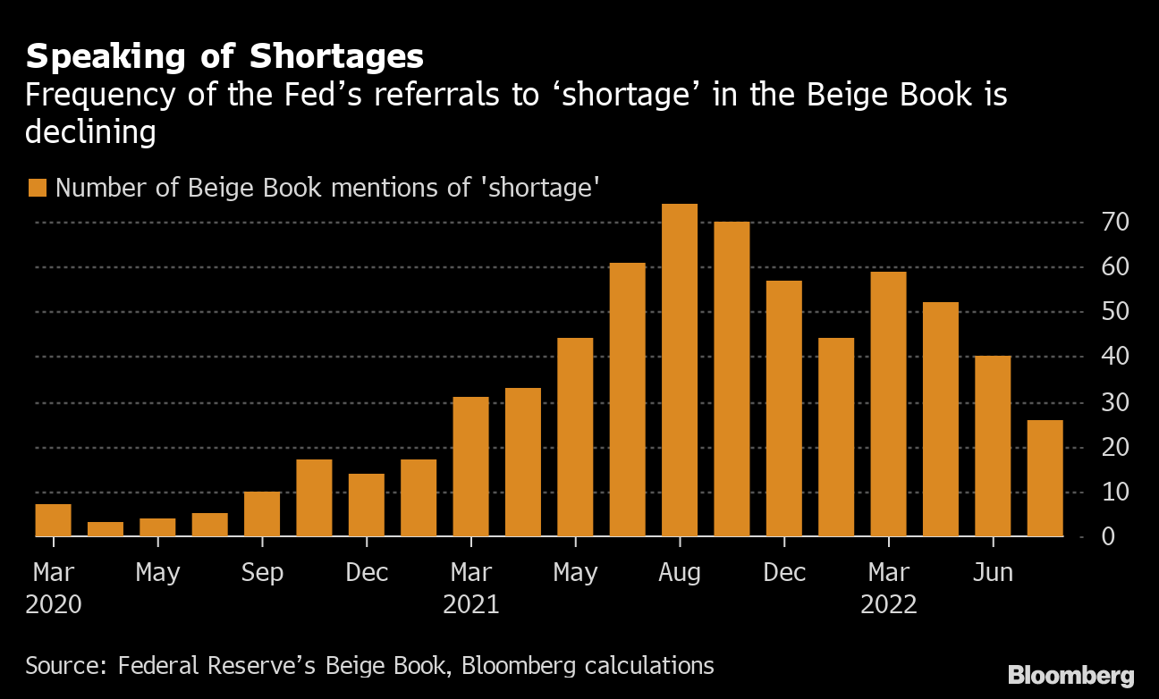 Here's a not-so-scientific tally of where things stand in the Fed's recent observations: the number of times the word “shortage” appears in this survey, called the Beige Book. These could be references to shortages of labor, materials or other keys to production. While the number is still more than double its pre-pandemic level, it has declined to about one-third of its peak in August 2021:
