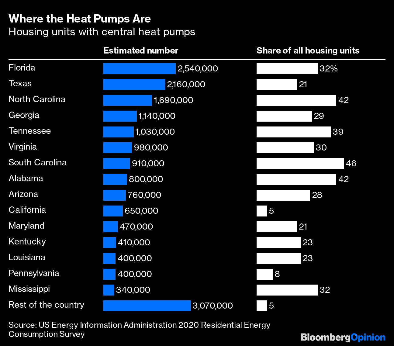 Beyond switching to electricity, another priority of those hoping to cut carbon-dioxide emissions is substituting heat pumps for less-energy-efficient gas, oil or electric furnaces. The EIA asked about heat pumps too. There are too many states with data withheld to make a map worthwhile, so here's a table of the 15 states with the most central-heat pumps, which account for almost two-thirds of the national total and are mostly in the South.