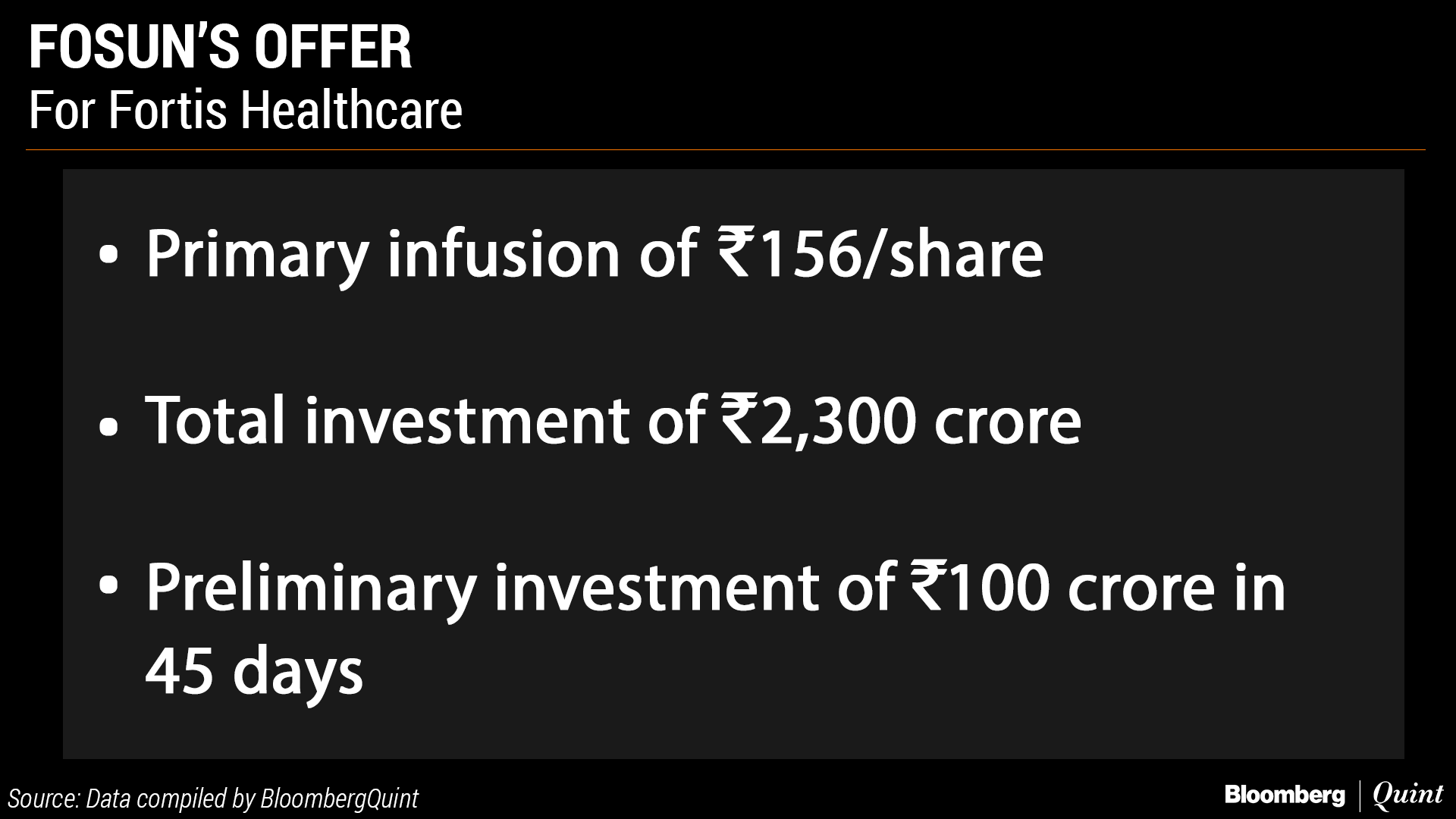 It proposed injecting a preliminary amount of Rs 100 crore through a wholly owned subsidiary Fosun Health Holdings Ltd. within the next 45 days that includes an option of immediately subscribing to convertible debt instruments. That's on the condition if Fortis agrees to a one-month period of exclusivity for Fosun to undertake due diligence and negotiate a proposal to buy stake.