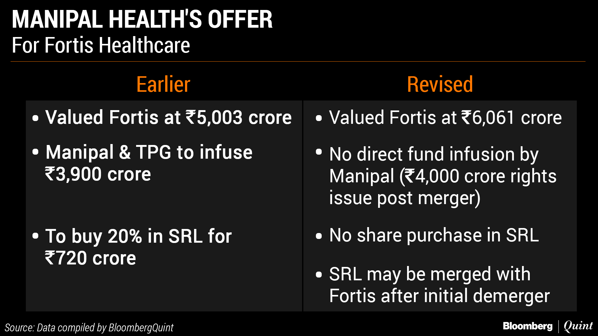 Ranjan Pai-led Manipal Health Pvt. Ltd. was the first to make a binding offer to Fortis. The first offer was a two-step deal to first demerge Fortis' hospitals business into TPG-backed Manipal Hospitals. Fortis would later divest stake in its diagnostics business to Manipal Health.