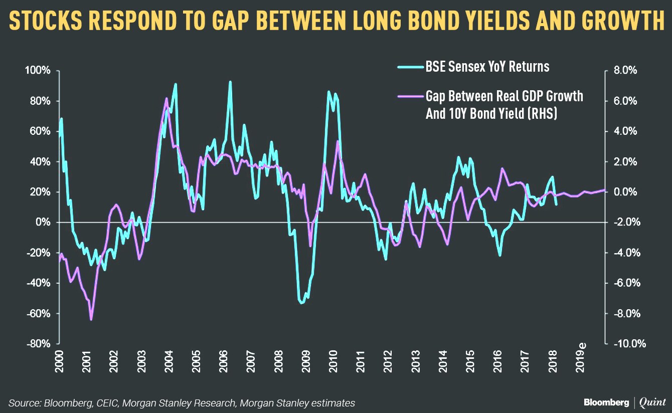 Notwithstanding Tuesday's move, long bond yields are up over 100 basis points since their 2017 lows. Are rising long bond yields bad for share prices? It all depends on growth, on which we remain constructive. While we answer the how and why questions here under, in summary, we think the growth cycle in India is turning and a front-ended rise in bond yields is good news for equities. The risks to equities are that bonds offer better value than equities at current levels and/or inflation undergoes a supply shock from higher fiscal spending, rising oil prices and/or higher food prices.