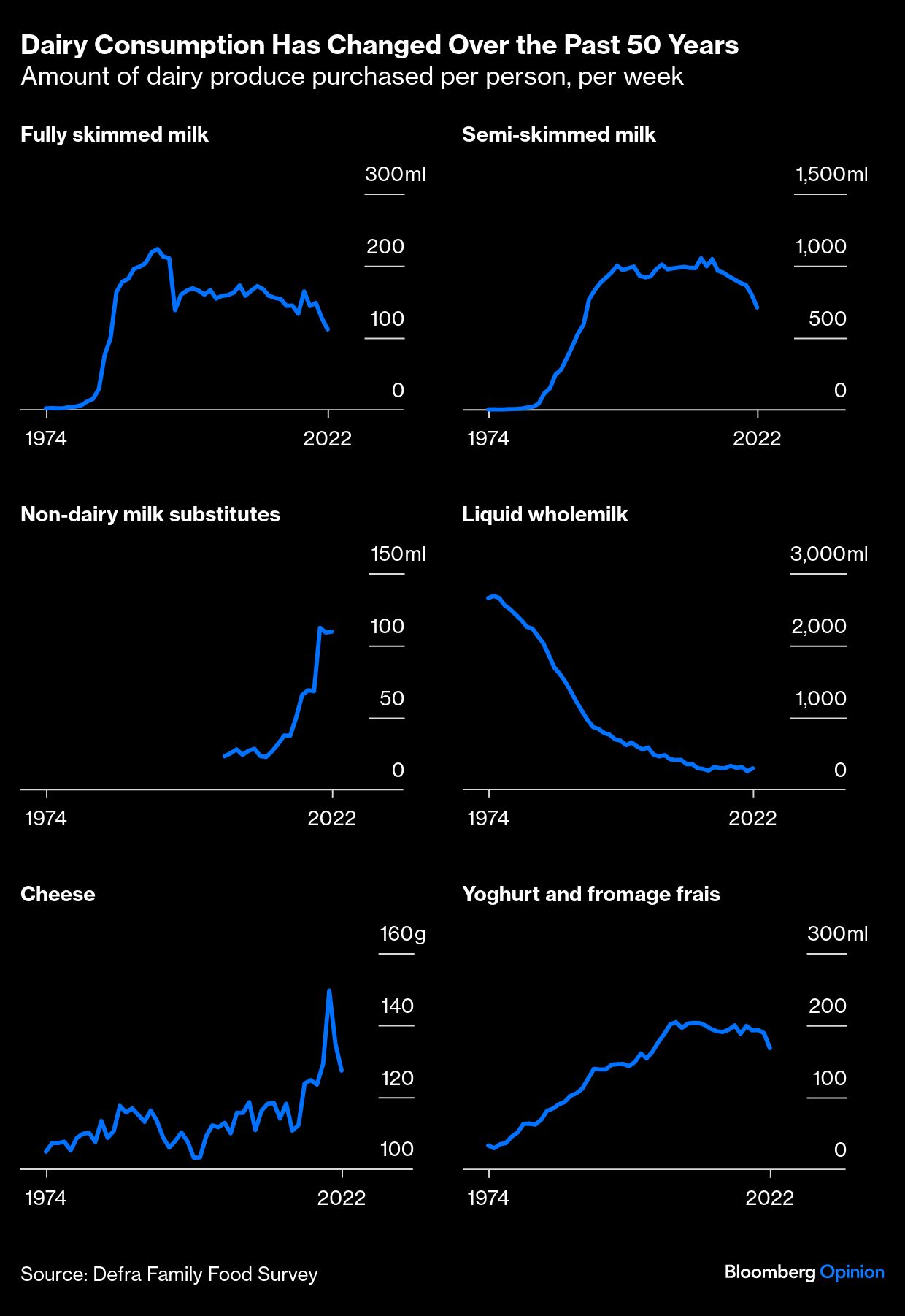 While cheese consumption has increased slightly, consumption of semi-skimmed milk peaked in 2012. Meanwhile, non-dairy milk substitutes have climbed to about 110 milliliters (around 4 ounces) per person a week in 2022 from less than 25 milliliters in 2004, when it was first broken out as a separate category — this still represents only a fraction of cow's milk being quaffed, but it's an impressive growth rate.
