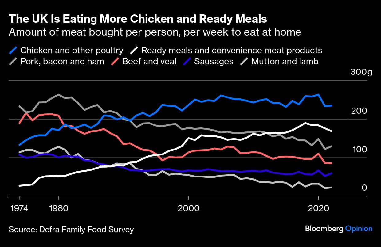 In the last few years, price has almost certainly been a factor influencing our shopping baskets. As the sticker shocks caused by Russia's invasion of Ukraine hit in 2022, you can see drops in consumption of categories including fish and cheese. But our diets have changed a lot since the 1970s, and I suspect the long-term declines in meat consumption are thanks in part to the globalization of food — we didn't just start importing more produce from overseas (which has enabled us to eat fresh tomatoes, for example, all year), but we've been more exposed to plant-based recipes from different cultures.