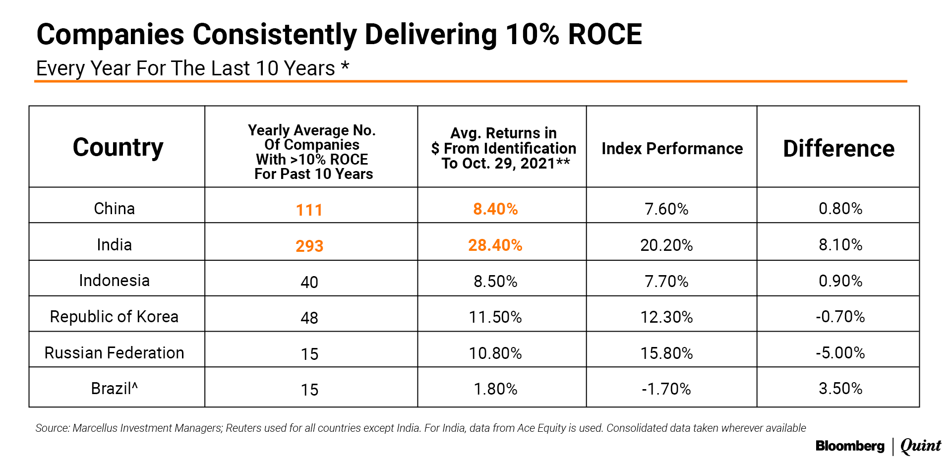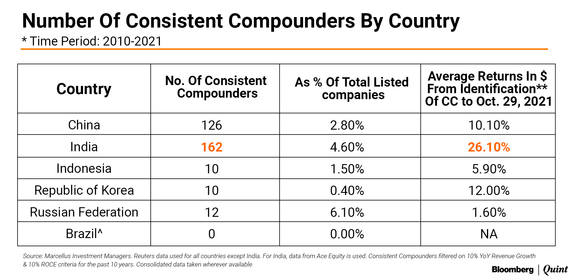 Source: Marcellus Investment Managers. Reuters data used for all countries except India. For India, data from Ace Equity is used. Consistent Compounders filtered on 10% YoY Revenue Growth & 10% ROCE criteria for the past 10 years. Consolidated data taken wherever available.