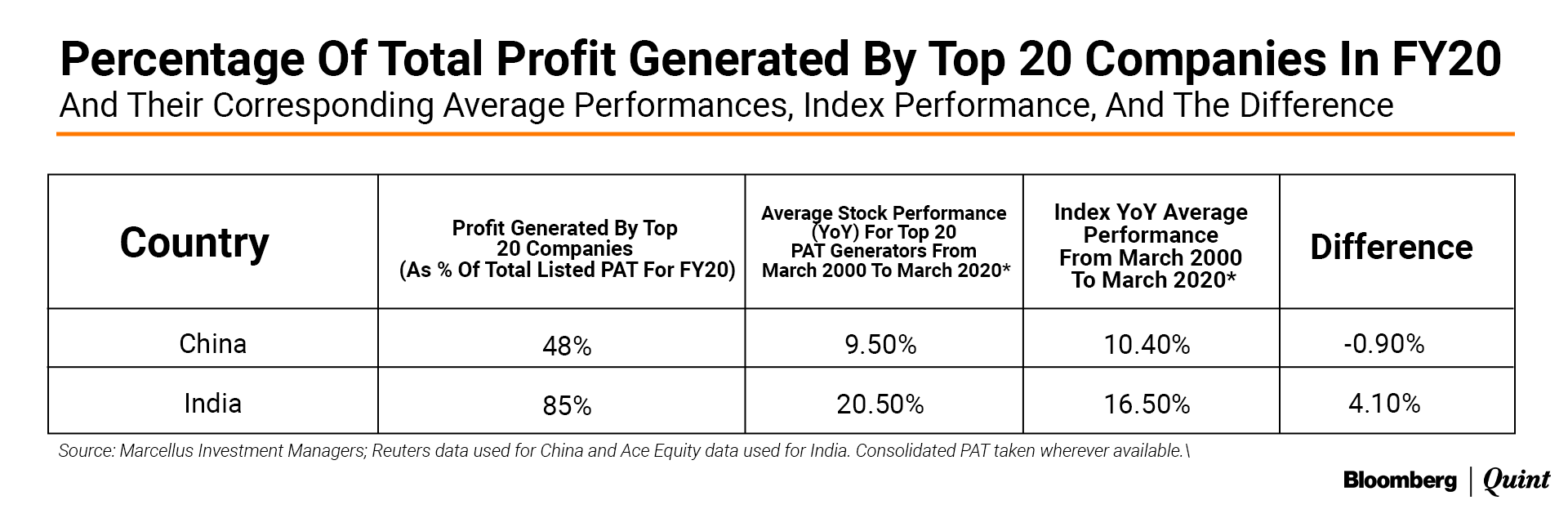 As shown in the first chart and this most recent table, the share of PAT accounted for by the top 20 PAT generators in India is: (a) twice the level of their Chinese counterparts; and (b) has almost doubled (from 45% to 85%) the past ten years.