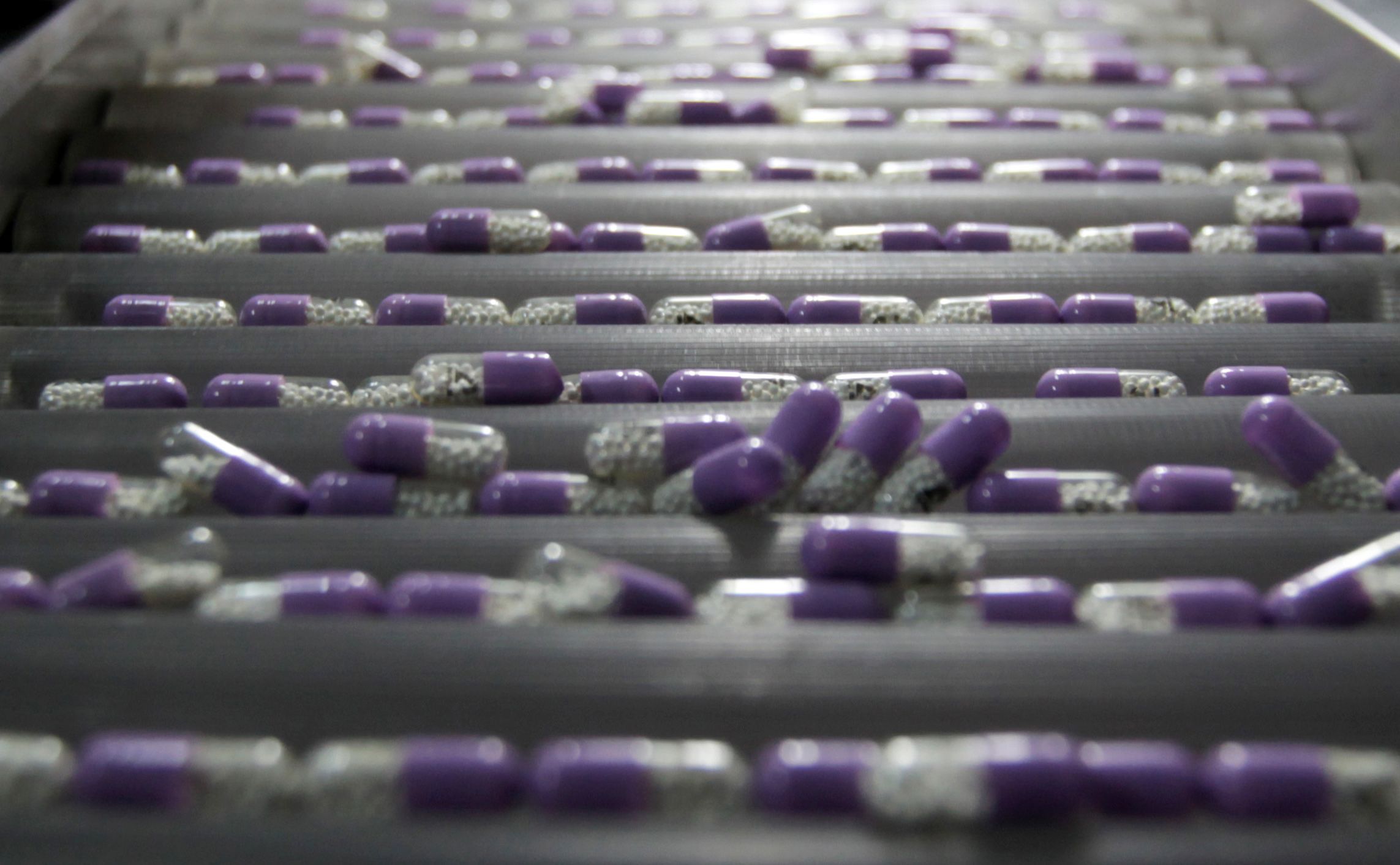 Capsules are laid out for inspection on the production line of a drug factory. (Photographer: Tomohiro Ohsumi/Bloomberg)