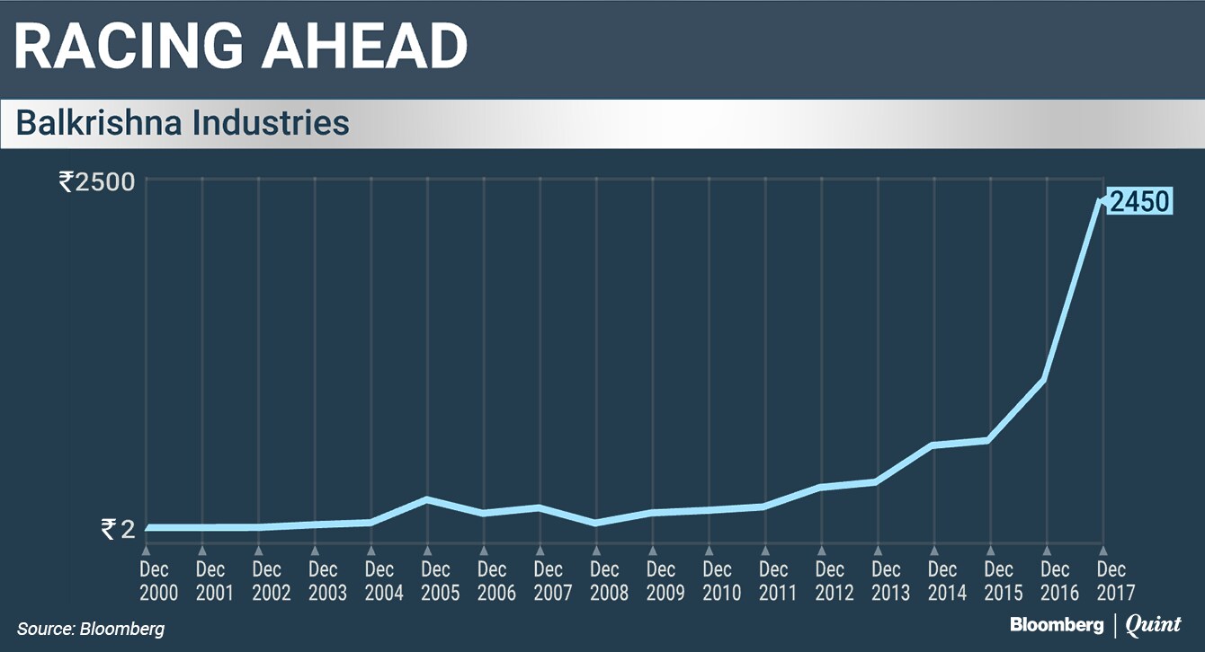 Founded in 1987 as a bicycle tyremaker, Balkrishna Industries' rise over the past decade and a half has been phenomenal after it diversified into making tyres for off-the-road, industrial and construction vehicles. Its shares rose from nearly Rs 2 apiece in 2000 to about Rs 2,384 now. The company, 54 percent owned by Arvind Poddar and family, is valued at over Rs 23,000 crore, second only to market leader MRF Ltd.