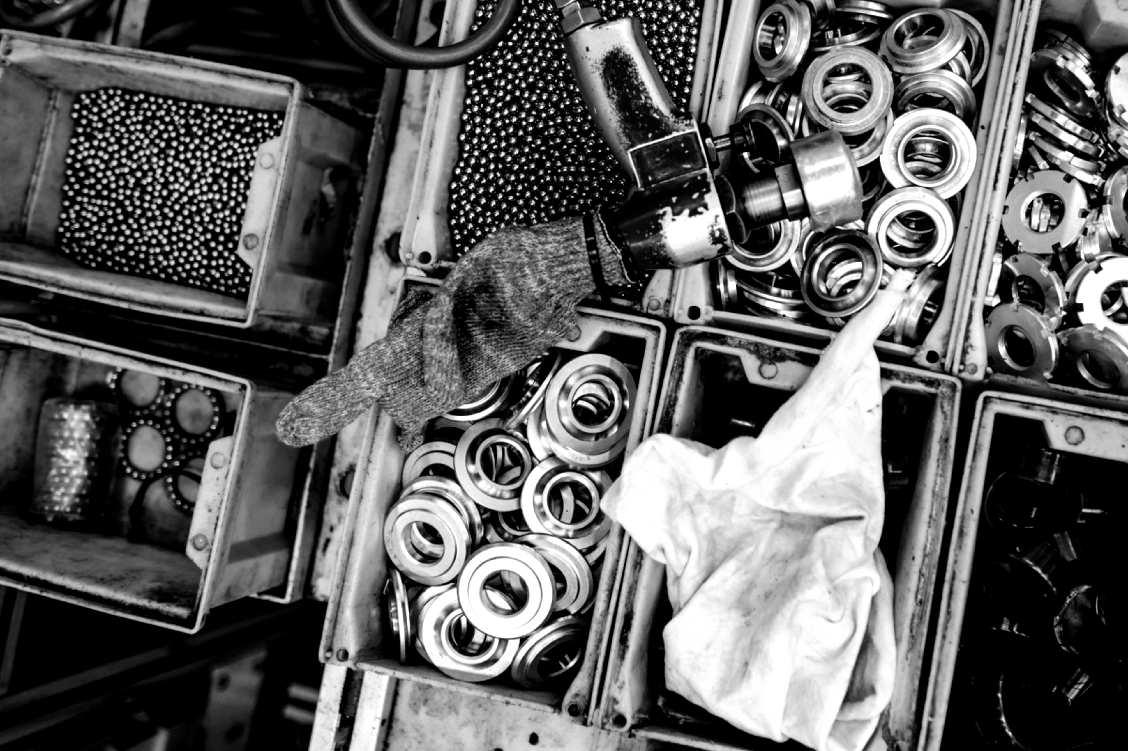 Auto parts sit in containers on the Royal Enfield production line, in Chennai. (Photographer: Dhiraj Singh/Bloomberg)