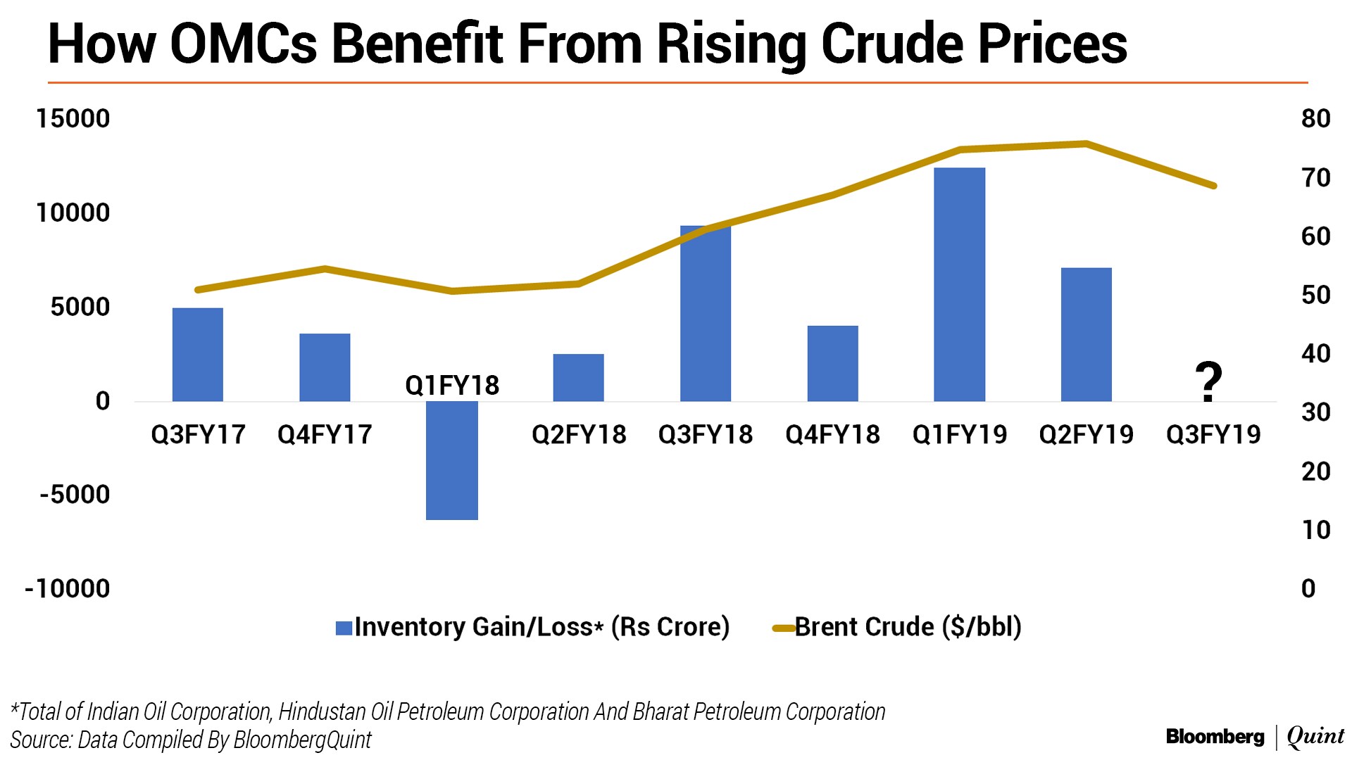 If the market price falls, refiners who bought the existing stock at a higher rate end up selling it cheaper and vice-versa. Brent crude averaged lower at $68.81 a barrel in the quarter ended December over excess supply and tepid demand growth. This may lead to the first inventory loss in six quarters for the three listed oil retailers—Indian Oil Corporation Ltd., Bharat Petroleum Corporation Ltd. and Hindustan Petroleum Corporation Ltd.