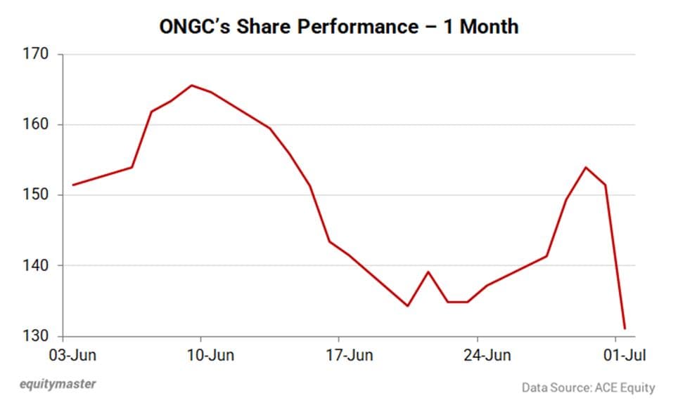 Post the announcement, ONGC's share price fell over 13% to Rs 131. Over the last month, the stock is down by almost 16%.