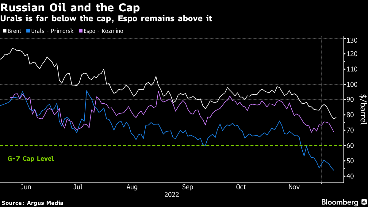 (Bloomberg) -- Four days into the G-7's cap on Russian oil prices, and it appears most — but not all — of it is trading well below the threshold being imposed on Moscow.