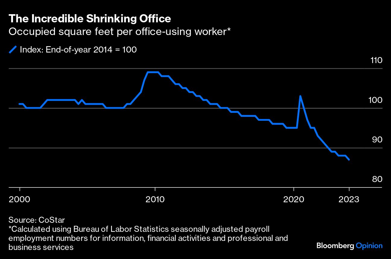 (Bloomberg Opinion) -- In the decade before the pandemic, the amount of office space per worker in the US shrank steadily — a trend given the charming name “densification.” Saving money was one driver, as was a belief among some employers that denser layouts encouraged interaction and innovation. But the best predictor of densification was “market-level job growth and the availability of space (or lack thereof),” commercial real estate brokerage Cushman & Wakefield concluded in a 2018 analysis of the phenomenon. That is, in large office markets such as Manhattan and San Francisco and up-and-coming ones such as Miami and Nashville, companies were simply hiring workers faster than they could find space for them.