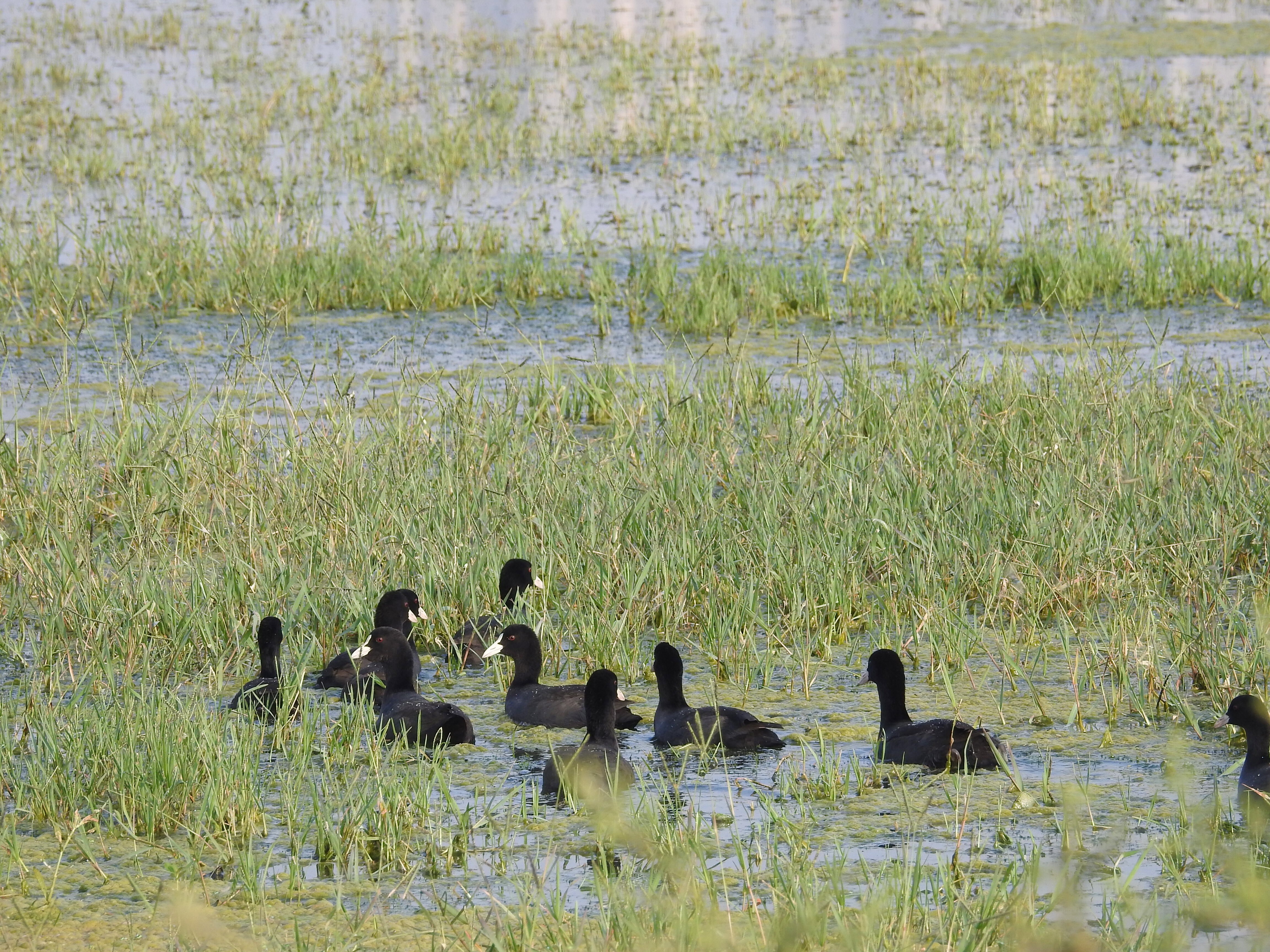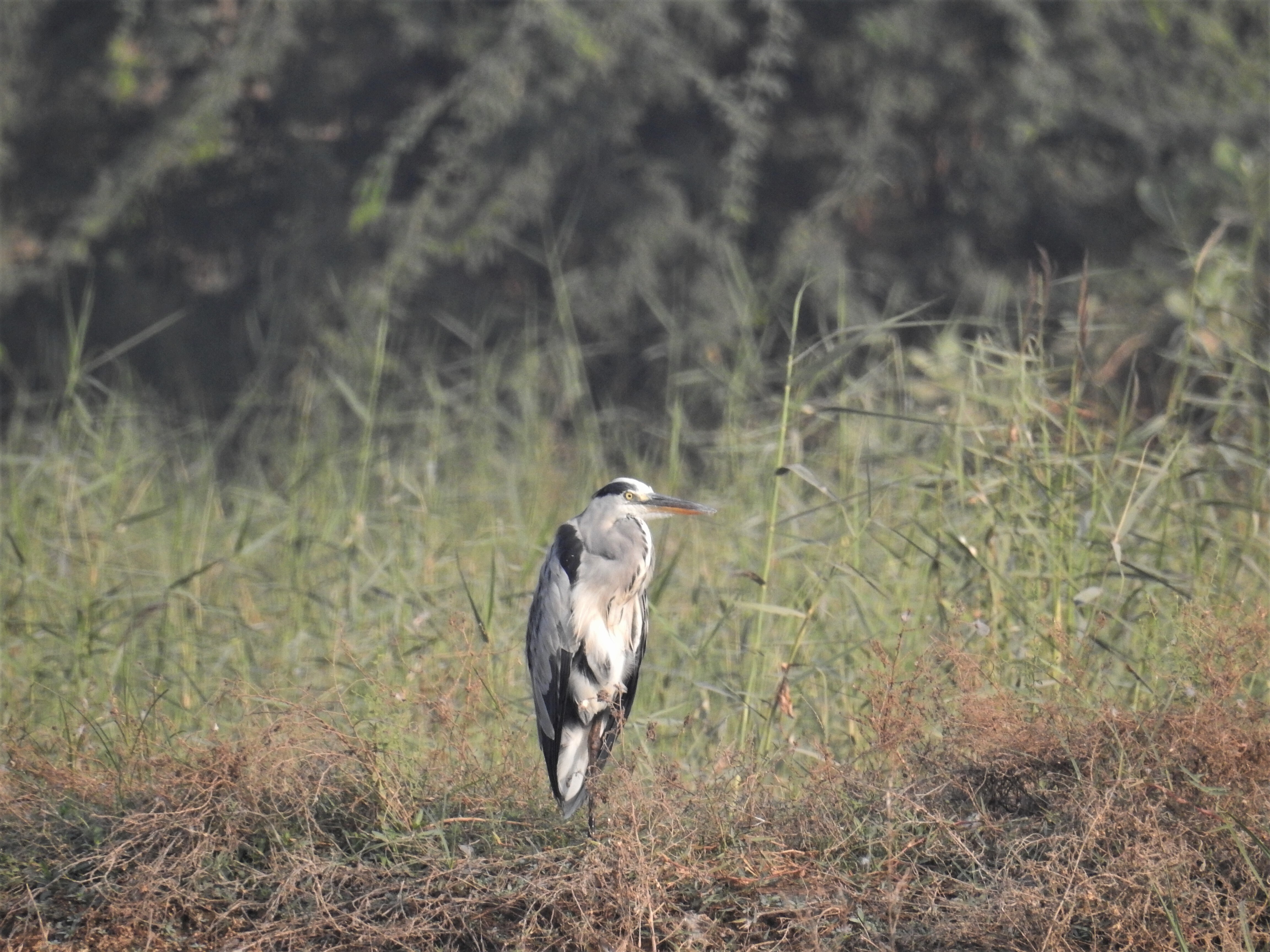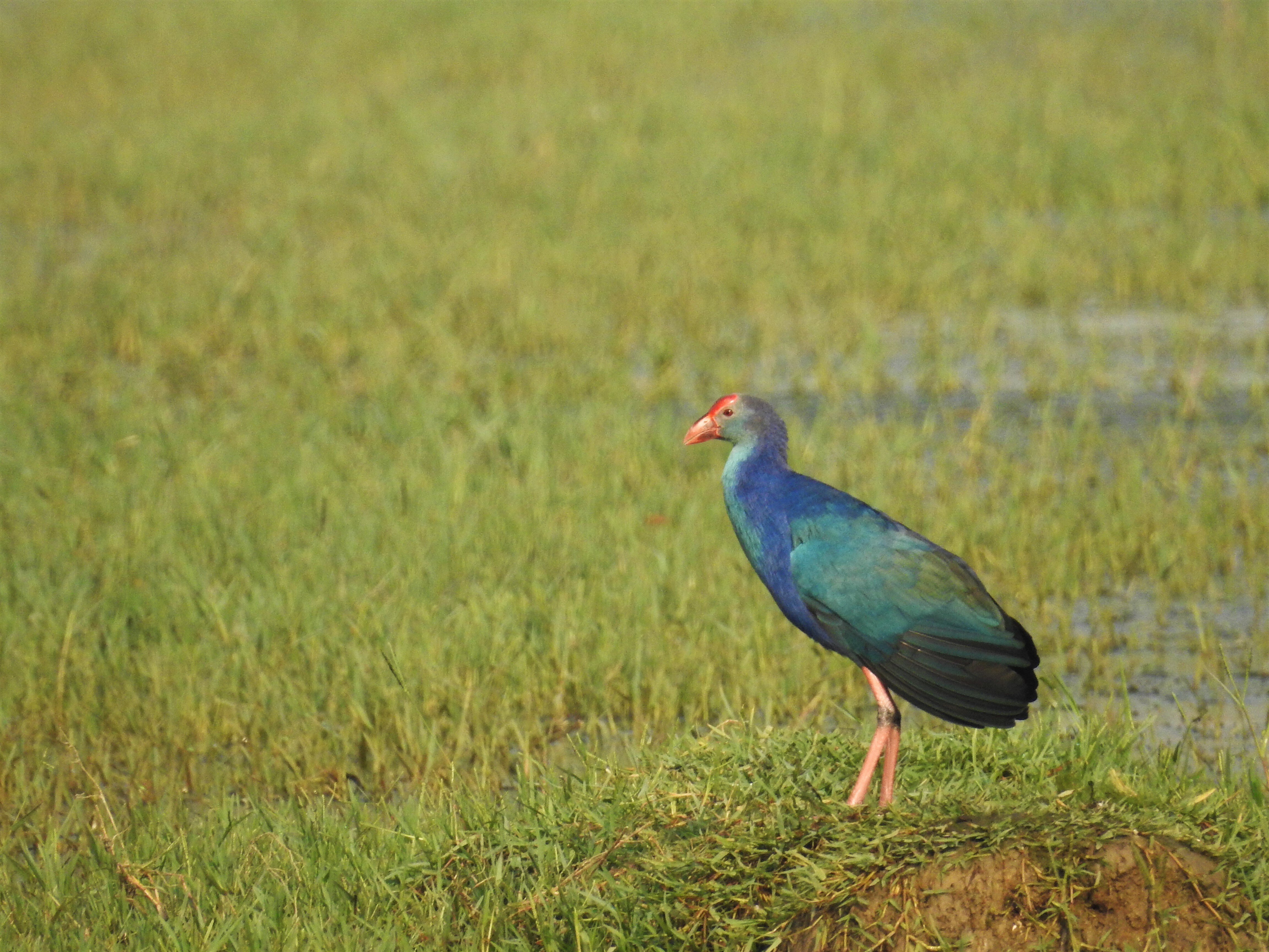 The Wagtail migrates to India each year from wet areas in Palearctic regions, Baluchistan or Himalayas, traveling long and tiring distances to come South. It then finds itself in neglected wetlands like Basai – invaluable spots for an exhausted little bird. At the same site, a brilliant Red Munia bird, coloured something like a strawberry, searched for nesting material. Busy Coots and iridescent Purple Swamphens swam in the water.